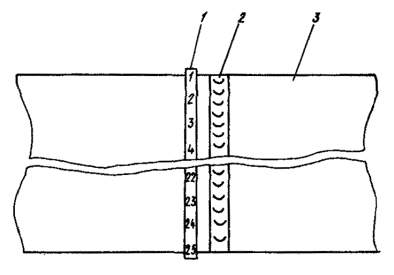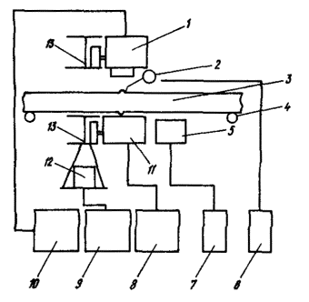 2.1.4. Для документального подтверждения результатов контроля применяют фотоприставку, имеющую аппарат с фокусировкой изображения сквозь объектив, например, типа «Зенит». Возможно применение фотоаппаратов других типов с подобными или более высокими параметрами. 2.1.5. Чувствительность контроля определяют с помощью проволочных или канавочных эталонов чувствительности по ГОСТ 7512. 2.1.6. Контролируемые участки сварного соединения маркируют знаками по ГОСТ 15843-79. Схемы размещения знаков по ГОСТ 7512-82*. 2.1.7. Для измерения на телевизионном экране изображений дефектов размером до 1,5 мм применяют измерительную лупу ЛИ-3 по ГОСТ 25706 с ценой деления 0,1 мм, а для измерений дефектов размером свыше 1,5 мм - прозрачную измерительную линейку с ценой деления 1,0 мм. 2.2. Средства механизации 2.2.1. При рентгенотелевизионном контроле следует использовать устройство, обеспечивающее плавное перемещение изделия ила рентгеновского аппарата и преобразователя с ВПБ со скоростью до 3 м/мин. При фотографировании дефектных участков сварного шва должно быть обеспечено прекращение перемещения (остановка) изделия или рентгеновского аппарата и преобразователя на время фотографирования. 2.2.2. Обнаруженные дефекты фиксируют на изделии с помощью устройства, обеспечивающего дистанционную отметку дефектов (краскоотметчик и Метка-1, Метка-2 и др.). 3. МЕТОДИКА ПРОВЕДЕНИЯ РЕНТГЕНОТЕЛЕВИЗИОННОГО КОНТРОЛЯ3.1. Рентгенотелевизионный контроль сварных соединений следует проводить после устранения наружных дефектов, обнаруженных при визуальном контроле. 3.2. Перед проведением рентгенотелевизионного контроля сварной шов и околошовная зона размерами по ГОСТ 7512 должны быть очищены от шлака, брызг расплавленного металла, загрязнений, изображения которых могут помешать расшифровке рентгенотелевизионного изображения. 3.3. Схема рентгенотелевизионного контроля сварных соединений приведена на черт. 1. Схема рентгенотелевизионного контроля сварных стыковых соединений резервуаров Черт. 1. 1 - источник излучения; 2 - дефектоотметчик; 3 - контролируемое соединение; 4 - ролики рольганга; 5 - привод рольганга; 6 - пульт управления дефектоотметчика; 7 - пульт управления рольганга; 8 - видеоконтрольное устройство; 9 - пульт управления механизма перемещения; 10 - пульт управления рентгеновского аппарата; 11 - преобразователь радиационного изображения; 12 - привод механизма перемещения; 13 - механизм перемещения. 3.4. Для определения чувствительности контроля и соблюдения оптимальных режимов просвечивания перед проведением контроля на преобразователь радиационного изображения следует установить проволочные или канавочные эталоны чувствительности по ГОСТ 7512. 3.4.1. Проволочные эталоны на преобразователе радиационного изображения размещают таким образом, чтобы изображения эталонов на экране ВКУ рентгенотелевизионной установки налагались на изображение шва (с направлением проволочек поперек шва) и направление проволочек не совпадало с направлением развертки изображения по строкам. 3.4.2. Канавочный эталон размещают на расстоянии не менее 5 мм от шва с направлением канавок поперек шва. Направление канавок не должно совпадать с направлением развертки изображения по строкам. 3.4.3. Если при контроле сварных соединений суммарная толщина канавочного эталона чувствительности и основного металла конт
