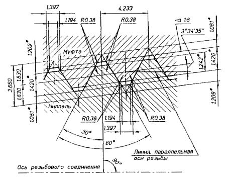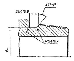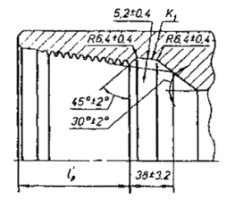 Примечание - Предельные отклонения в таблице 2 являются исходными для проектирования резьбообразующего инструмента и факультативными для изделий. 4.4 Предельные отклонения от номинальных значений параметров резьбы не должны быть более: - шага резьбы с полным профилем: на длине 25,4 мм между любыми двумя витками, мм ............................................................. ±0,04 на всей длине, мм ........................................................................................................................... ±0,11 - угла наклона боковой стороны профиля 30° ........................................................................... ±40 - конусности на длине конуса с полным профилем резьбы, отнесенная к 100 мм: наружного и среднего диаметра резьбы ниппеля, мм .............................................................. +0,25 -0,5 внутреннего и среднего диаметра резьбы муфты, мм ............................................................. -0,25 - радиуса сопряжения вершин профиля резьбы r1, мм ............................................................. +0,20 4.5 Размеры, параметры и предельные отклонения резьбовых соединений должны соответствовать указанным на рисунке 4 и в таблице 3. 4.6 Допуск перпендикулярности упорного уступа ниппеля и упорного торца муфты к оси резьбы не должен быть более 0,10 мм, а допуск плоскостности на ширине упорного уступа ниппеля и упорного торца муфты - 0,07 мм. 4.7 Допуск соосности осей конической выточки (d4, рисунок 4) и резьбы муфт 0,2 мм. Таблица 3 - Размеры, параметры и предельные отклонения резьбовых соединений, мм
