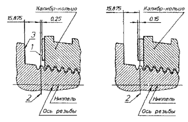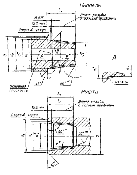должны соответствовать 4.12 Натяг резьбы муфты должен соответствовать указанному на рисунке 6. 4.13 Механические свойства металла после термической обработки деталей резьбового соединения (ниппеля и муфты) приведены в приложении Г. 1 - контрольная плоскость; 2 - основная плоскость; 3 - упорный торец Рисунок 6 4.15 Для предохранения резьбового соединения от коррозии и заедания резьба и упорные поверхности должны быть фосфатированы (марганцовисто-железистое фосфатирование), толщина покрытия 0,015-0,020 мм. Допускаются другие способы защиты поверхности, например, поликомпозиционные покрытия на основе меди. 5 ПРАВИЛА ПРИЕМКИ5.1 Для проверки соответствия резьбовых соединений требованиям настоящего стандарта проводят приемочный контроль и периодические испытания. 5.2 Приемочному контролю подвергают: - каждые ниппель и муфту - на соответствие требованиям 4.10- 4.12, 4.14-4.16. Периодически должны быть проверены ниппели и муфты на соответствие требованиям 4.2-4.7 в объемах, сроках и по методике, согласованных с изготовителем и потребителем. 5.3 Периодические испытания резьбового соединения, прошедшего приемочный контроль, проводят не реже одного раза в два года по программе и методике испытаний на определение ресурса при многократном свинчивании-развинчивании и предела выносливости при знакопеременном изгибе. 5.4 При получении неудовлетворительных результатов приемочного контроля, хотя бы по одному из показателей, проводят повторный приемочный контроль на удвоенной выборке этого типа продукции. Результаты повторного приемочного контроля распространяются на партию данной продукции. 6 МЕТОДЫ КОНТРОЛЯ6.1 Проверка геометрических размеров и параметров резьбовых соединений должна осуществляться с помощью универсальных измерительных средств в соответствии с технической документацией, утвержденной в установленном порядке. 6.2 Натяг резьбы ниппелей и муфт контролируется рабочими резьбовыми калибрами. 6.3 Перед проверкой натяга поверхность резьбы должна быть тщательно очищена и на поверхность резьбы должен быть нанесен топкий слой жидкого масла. Калибр навинчивается на резьбу усилием одного человека с применением рычага 150 мм. 6.4 Рекомендуется контролировать резьбу гладкими калибрами с натягами, соответствующими резьбовым калибрам. 6.5 Шероховатость поверхности резьбы, упорных уступов и торцев проверяют сравнением с рабочими образцами шероховатости по ГОСТ 9378. 6.6 Качество фосфатного покрытия на резьбе проверяется в трех равномерно расположенных точках по окружности витка резьбы капельным или другим способом по ГОСТ 9.302. 6.7 Испытания на износ резьбового соединения при многократном свинчивании проводятся на стенде по согласованной методике. 6.8 Испытания на сопротивление усталости при знакопеременном изгибе резьбового соединения проводятся на стендовых установках при плоском или круговом изгибе по согласованной методике. 7 ТРАНСПОРТИРОВАНИЕ И ХРАНЕНИЕ7.1 Резьбы и упорные поверхности ниппелей и муфт должны быть надежно защищены от повреждений металлическими предохранительными деталями (пробка, кольцо). Допускается применение предохранительных деталей из других материалов (полиэтилен плюс металлическая арматура), обеспечивающих надежную защиту резьбы. 7.2 При транспортировании резьба и упорные поверхности соединения должны быть покрыты 