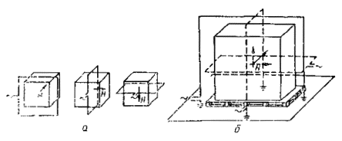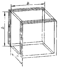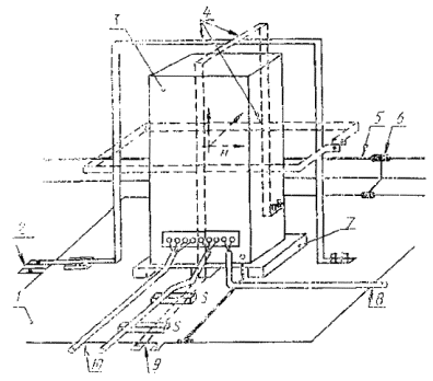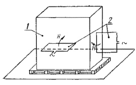 где Н - напряженность магнитного поля, А/м, п - число витков каждой катушки, b - длина стороны катушки, м, I - ток, А Рабочий объем двойной катушки, состоящей из катушек стандартного размера и разнесенных на 0,8 м, при неоднородности ноля ±3 дБ равен 0,6 ´ 0,6 ´ 1 м (высота). 6.2.1.2 Индукционная катушка для испытаний напольных ИТС Размеры индукционной катушки должны соответствовать размерам ИТС при различных плоскостях поляризации ЗКМП. Расстояние проводников катушки от наружных поверхностей ИТС должно составлять не менее 20 % длины каждой стороны катушки. Индукционная катушка должна быть выполнена из провода толщиной не более 10 мм. 1 - стол из немагнитного материала; 2 - плоскость заземления; 3 - к ИГ; 4 - ИТС; 5 - индукционная катушка; 6 - соединение плоскости заземления с цепью защитного заземления; 7 - защитное заземление; 8 - изолирующая опора; 9 - к сети электропитания; 10 - к ИГ; 11 - к источнику сигналов (имитатору) Рисунок 4 - Рабочее место для испытаний настольных ТС на устойчивость к ЗКМП 1 - плоскость заземления; 2 - к ИГ; 3 - ИТС; 4 - индукционная катушка; 5 - защитное заземление; 6 - соединение плоскости заземления с цепью защитного заземления; 7 - изоляционная опора; 8 - к сети электропитания; 9 - к ИГ; 10 - к источнику сигналов (имитатору) Рисунок 5 - - Рабочее место для испытаний напольных ТС на устойчивость к ЗКМП 1 - ИТС; 2 - индукционная катушка Рисунок 6 - Схема проверки восприимчивости ИТС к ЗKМП с использованием метода приближения Рисунок 7 - Схема катушки Гельмгольца Рабочий объем индукционной катушки определяется ее рабочей поверхностью (50 ´ 50 % от длины каждой стороны катушки), умноженной на высоту, соответствующую 50 % длины короткой стороны катушки. 6.2.2 Калибровка индукционной катушки. Коэффициент катушкиИндукционная катушка должна быть откалибрована до начала испытаний в отсутствии ИТС. При калибровке катушка должна быть установлена на расстоянии не менее 1 м от стены лаборатории, а также от любой конструкции из магнитного материала и подсоединена к ИГ, как указано в 6.1.2. Калибровку осуществляют с использованием тока промышленной частоты. Амплитуда тока должна быть выбрана такой, чтобы получить напряженность ЗКМП, соответствующую требуемой степени жесткости испытаний. Полученное таким образом значение амплитуды тока используется при проведении испытаний ТС на устойчивость к ЗКМП. Для контроля напряженности ЗКМП, создаваемого индукционной катушкой, должен использоваться датчик магнитного поля. Датчик поля должен быть установлен в центре индукционной катушки и иметь соответствующую ориентацию, чтобы выделять максимальное значение поля. Коэффициент индукционной катушки определяется как отношение Н/I, где H - напряженность магнитного поля в А/м, I - ток, протекающий по катушке в А. Метод калибровки индукционной катушки приведен в приложении В. Характеристики индукционных катушек различных размеров, предназначенных для проведения испытаний настольных и напольных ИТС на устойчивость к ЗКМП, - по ГОСТ Р 50648. 6.3 Измерительные приборы и вспомогательное оборудованиеИзмерительные приборы включают аппаратуру для установки и измерения тока в индукционной катушке, а также устройства развязки и помехоподавляющие фильтры для цепей электропитания, управления и передачи сигналов. Устройства развязки предназначены для обеспечения стандартного входного сопро