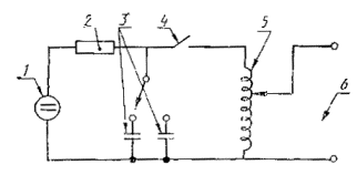 а - настольное ТС; б - напольное ТС Рисунок 1 - Схема воздействия ЗКМП на ТС с использованием иммерсионного метода Рисунок 2 - Форма выходного тока ИГ 1 - источник высокого напряжения; 2 - зарядный резистор; 3 - конденсаторы колебательного контура; (для частот 0,1 и 1 МГц); 4 - устройство управления длительностью посылок тока; 5 - катушка колебательного контура; 6 - к индукционной катушке Рисунок 3 - Схема ИГ Продолжительность испытаний, с ..................................................................................... 2 ± 10 %; Выходной ток, (поделенный на коэффициент катушки), А ........................................... 10-100 Напряжение и напряженность поля индустриальных радиопомех, создаваемых включенным ИГ при отсутствии генерации посылок тока, не должны превышать значений, установленных «Общесоюзными нормами допускаемых индустриальных радиопомех» (Нормы 8-72). ЗКМП, создаваемое ИГ, не должно влиять на уровень испытательного магнитного поля, создаваемого индукционной катушкой. Для этого подсоединение ИГ к индукционной катушке должно осуществляться скрученными проводами и ИГ должен располагаться на расстоянии не менее 3 м от катушки. Форма выходного тока ИГ приведена на рисунке 2. Схема ИГ приведена на рисунке 3. Примечание - Для стандартной индукционной катушки со стороной 1 м выходной ток ИГ должен изменяться от 12 до 120 А. 6.1.2 Проверка характеристик ИГПри проверке характеристик ИГ измеряют: - амплитудное значение выходного тока; - степень затухания; - частоту колебаний; - частоту повторения. Параметры выходного тока измеряют при подключении ИГ к стандартной индукционной катушке (6.2). Измерения выполняют с помощью измерительных приборов с погрешностью 10 %. 6.2 Индукционная катушка6.2.1 Характеристики индукционной катушкиИндукционная катушка, подключенная к ИГ, должна обеспечить создание ЗКМП с напряженностью, соответствующей установленной степени жесткости и заданной точности. Индукционная катушка должна быть изготовлена из меди, алюминия или другого проводящего немагнитного материала; ее поперечное сечение и конструктивное исполнение должны обеспечивать устойчивую установку при испытаниях. Индукционная катушка может быть одновитковой, если она обеспечивает протекание тока, необходимого при заданной степени жесткости испытаний. Многовитковая индукционная катушка может применяться для создания заданного испытательного магнитного поля при пониженном токе ИГ. Индукционная катушка должна иметь размеры, соответствующие размерам ИТС, так чтобы охватить его в трех ортогональных плоскостях. В зависимости от вида и назначения ИТС могут применяться индукционные катушки различных размеров. Индукционные катушки размерами, указанными в 6.1, пригодны при создании ЗКМП в объеме ИТС (настольных - рисунок 4, напольных - рисунок 5). Неравномерность ЗКМП, в рабочем объеме индукционной катушки должна быть не более ±3 дБ. Пример расположения индукционной катушки при проверке устойчивости ТС к ЗКМП методом приближения приведен на рисунке 6. 6.2.1.1 Индукционная катушка для испытаний настольных ИТС Стандартная индукционная катушка для испытаний малогабаритных ИТС, устанавливаемых на столе (счетчиков электрической энергии, устройств систем управления и др.), должна иметь форму квадрата (круга) с размером стороны (диаметра), составляющим 1 м, и изготовляться из одного витка провода толщиной не более 10 мм. Р