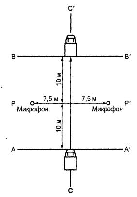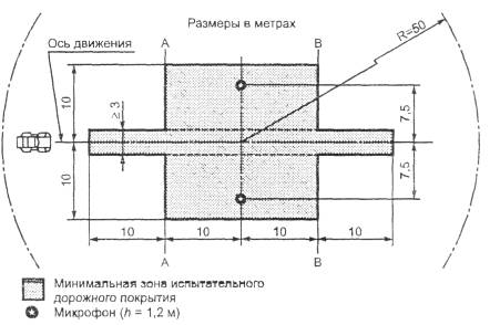 *В зависимости от климатических условий. Как правило, используют наиболее твердый вяжущий материал. 4 Метод испытания 4.1 Измерение остаточной пористости Образцы покрытия площадки должны быть высверлены не менее чем в четырех точках, равномерно распределенных в испытательной зоне между линиями АА и ВВ (см. рисунок 4.1). Для исключения неточностей, связанных с неоднородностью и неровностью покрытия на участках траекторий колес, образцы покрытия должны быть высверлены не по траекториям колес, а рядом с ними. Не менее двух образцов должны быть высверлены рядом с траекториями колес и один образец (как минимум) приблизительно посередине между траекториями колес и каждой точкой расположения микрофона. Если существует подозрение относительно выполнения условия однородности (см. 2.4 настоящего приложения), то образцы должны быть высверлены в большем числе точек в пределах испытательной зоны. Остаточную пористость определяют для каждого образца, затем вычисляют среднее значение для всех образцов, которое сравнивают с указанным в 2.1 настоящего приложения. Кроме этого, ни один образец не должен иметь пористость более 10 %. Строителям испытательного покрытия следует помнить о проблеме, которая может возникнуть в случае, если испытательная зона подогревается трубами или электрическими кабелями и если в этой зоне нужно высверлить образцы. Расположение такого оборудования должно быть тщательно спланировано с учетом будущих точек высверливания образцов. Рекомендуется оставлять несколько участков размером приблизительно 200´300 мм, где нет кабелей/труб или они расположены достаточно глубоко, что позволяет избежать их повреждения при высверливании образцов из покрытия. 4.2 Коэффициент звукопоглощения Коэффициент звукопоглощения (нормальное падение) определяют методом труб согласно стандартам ИСО 10354-1-96 «Акустика. Определение коэффициента звукопоглощения и акустического импеданса в импедансных трубках. Часть 1. Метод с использованием стоячей волны» и ИСО 10354-2-96 «Акустика. Определение коэффициента звукопоглощения и акустического импеданса в импедансных трубках. Часть 2. Метод передаточной функции». Испытуемые образцы должны соответствовать требованиям остаточной пористости, указанным в 4,1 настоящего приложения. Коэффициент звукопоглощения измеряют в диапазонах 400-800 и 800-1600 Гц (по крайней мере на центральных частотах полос третьей октавы) и для обоих диапазонов определяют максимальные значения. Затем вычисляют среднее значение для всех испытуемых образцов, которое считают окончательным результатом. 4.3 Измерение глубины текстуры Измерения глубины текстуры проводят в десяти точках, равномерно расположенных по всей длине траекторий колес на испытательной площадке; среднее значение сравнивают с установленной минимальной глубиной текстуры. Измерения проводят по стандарту ИСО 10844-94. 5 Стабильность характеристик во времени и состав покрытия 5.1 Возраст покрытия Уровень шума, возникающего в результате трения между колесом и поверхностью испытательного покрытия, может незначительно увеличиваться в течение первых 6-12 мес после окончания строительства. Покрытие приобретет требуемые характеристики не ранее чем через четыре недели после окончания строительства. Возраст покрытия меньше влияет на уровень шума, производимого грузов