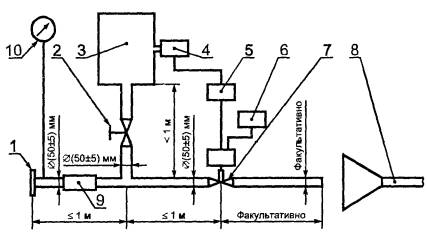 5.1.4.1.2 В течение периода эксплуатации на доведение транспортного средства до нужного состояния (50±10) % приходится на вождение в городских условиях, а остальная часть - на длительный пробег с высокой скоростью; непрерывная эксплуатация в условиях дорожного движения может быть заменена соответствующей программой испытаний на испытательной площадке. 5.1.4.1.3 Два скоростных режима должны использоваться поочередно минимум по шесть раз. 5.1.4.1.4 Полная программа испытаний должна включать минимум 10 остановок продолжительностью не менее 3 ч для воспроизведения эффекта охлаждения и конденсации. 5.1.4.2 Метод пульсации 5.1.4.2.1 Система выпуска или ее компоненты должны быть установлены на транспортном средстве или двигателе. В первом случае транспортное средство должно быть установлено на стенде с беговыми барабанами. Во втором случае двигатель должен быть установлен на испытательном стенде. Испытательное устройство, подробная схема которого приведена на рисунке 3.3, устанавливается на срезе выпускной трубы системы выпуска. Допускается применять любое другое устройство, обеспечивающее эквивалентные результаты. 5.1.4.2.2 Испытательное оборудование должно быть отрегулировано таким образом, чтобы поток отработавших газов поочередно прерывался и возобновлялся при помощи быстродействующего клапана 2500 раз. 5.1.4.2.4 Реле времени устанавливают на продолжительность выпуска отработавших газов с учетом требований 5.1.4.2.3. 5.1.4.2.5 Частота вращения двигателя должна составлять 75% частоты вращения (S), при которой двигатель развивает максимальную мощность. 5.1.4.2.6 Мощность, показываемая динамометром, должна составлять 50% мощности, измеряемой с полностью открытой дроссельной заслонкой при 75% частоты вращения двигателя (S). 5.1.4.2.7 Во время испытаний любые сливные отверстия должны быть закрыты. 5.1.4.2.8 Полная продолжительность испытаний составляет 48 ч. При необходимости через каждый час допускается период охлаждения. 5.1.4.3 Метод установки на испытательном стенде 5.1.4.3.1 Система снижения шума должна быть установлена на двигателе, представляющем тип двигателя, который установлен на транспортном средстве, для которого предназначена данная система. Двигатель с системой снижения шума должен быть установлен на испытательном стенде. 5.1.4.3.2 Подготовка системы состоит из предписанного для каждого диапазона рабочих объемов двигателя числа циклов на испытательном стенде и работы системы снижения шума в составе двигателя, для которого она предназначена. Число циклов для каждого диапазона приведено в таблице 3.2. Таблица 3.2