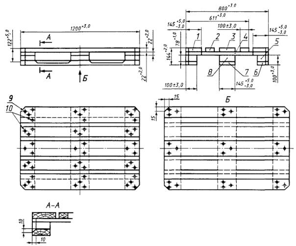 Поддон плоский деревянный размером 800 × 1200 мм 1 - доска настила (крайняя); 2 - доска настила (промежуточная); 3 - доска настила (средняя); 4 - доска поперечная; 5 - малая шашка; 6 - доска основания (крайняя); 7 - доска основания (средняя); 8 - большая шашка; 9 - винтовые гвозди диаметром 4,5 мм и длиной 90 мм; 10 - винтовые гвозди диаметром 3,5 мм и длиной 60 мм Черт. 1 (Измененная редакция, Изм. № 1). 1.3. Предельные отклонения размеров, не указанные на чертеже, не должны быть более ± 2 мм. 2. ТЕХНИЧЕСКИЕ ТРЕБОВАНИЯКонструкция поддона должна соответствовать требованиям ГОСТ 9078 и быть рассчитана на выдерживание без остаточных деформаций рабочих нагрузок, значения и характеристики которых приведены в табл. 2. Таблица 2