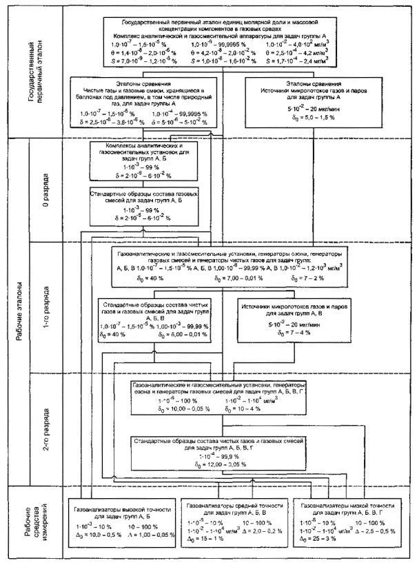 measurements. State verification schedule Дата введения 2002-11-01 1 Область примененияНастоящий стандарт распространяется на государственную поверочную схему для средств измерений содержания компонентов в газовых средах (приложение А) и устанавливает порядок передачи размеров единиц: молярной доли - процент (%), массовой концентрации - миллиграмм на кубический метр (мг/м3), массовой доли - процент (%) и объемной доли компонента - процент (%) - от государственного первичного эталона с помощью рабочих эталонов рабочим средствам измерений с указанием погрешностей и основных методов поверки. 2 Нормативные ссылкиВ настоящем стандарте использованы ссылки на следующие стандарты: ГОСТ 8.315-97 Государственная система обеспечения единства измерений. Стандартные образцы состава и свойств веществ и материалов. Основные положения ГОСТ 17.2.2.03-87 Охрана природы. Атмосфера. Нормы и методы измерений содержания оксида углерода и углеводородов в отработавших газах автомобилей с бензиновыми двигателями. Требования безопасности 3 ОпределенияВ настоящем стандарте применяют следующие термины с соответствующими определениями: 3.1 компонент в газовой смеси: Химически однородный газ, входящий в состав газовой смеси. 3.2 содержание компонента: Обобщенное наименование величин (молярной доли компонента, массовой доли компонента, массовой концентрации компонента и других), характеризующих химический состав газовых сред. В настоящем стандарте характеристики средств измерений приведены в единицах молярной доли и массовой концентрации компонента. Соответствующие значения других величин могут быть найдены путем пересчета с использованием справочных данных о свойствах чистых газов и газовых смесей. 3.3 группа газоаналитических задач (А, Б, В или Г): Совокупность газоаналитических задач, характеризуемых компонентным составом анализируемой газовой среды, измеряемой величиной и диапазоном ее значений, имеющих приблизительно одинаковую степень распространенности и приоритетности. При отнесении новых газоаналитических задач к группам А, Б, В и Г целесообразно руководствоваться приложением Б. 3.4 воспроизведение единицы [физической величины (величины)]: По [1]. Единицу величины для конкретной газоаналитической задачи воспроизводят путем косвенных измерений данной величины в интервале значений, характерных для этой задачи, посредством эталонов других величин (масса, вместимость, давление, объемный расход газа, сила тока и другие), функционально связанных с измеряемой, и (или) с использованием фундаментальных физических констант. Воспроизведение единиц для различных газоаналитических задач (далее - задачи) осуществляют с помощью эталонов, находящихся на разных ступенях государственной поверочной схемы. Воспроизведение единиц для задач группы А осуществляют с помощью государственного первичного эталона, для задач группы Б - с помощью рабочих эталонов 0 разряда - комплексов аналитических и газосмесительной установок, для задач групп В и Г - с помощью эталонных газоаналитических и газосмесительных установок 1-го и 2-го разрядов соответственно. 3.5 рабочий эталон: По [1]. В качестве рабочих эталонов в настоящей государственной поверочной схеме применяют комплексы аналитических, газоаналитических и газосмесительных установок, генераторы чистых газов, источники микропотоков га