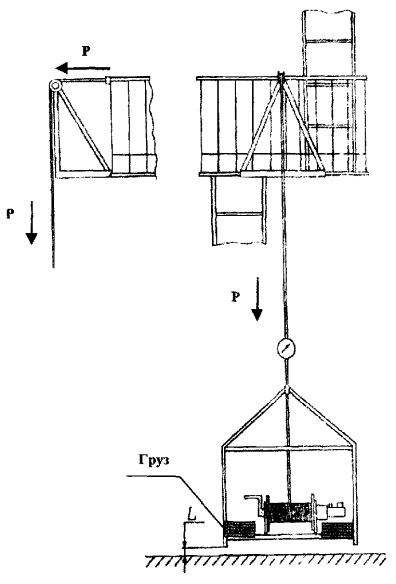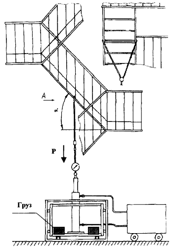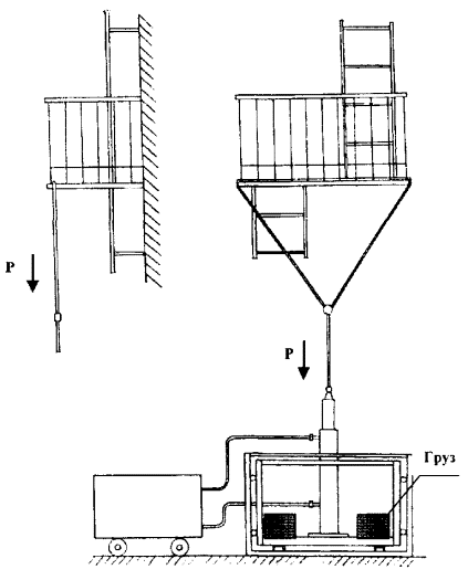 ____________ *Без учета коэффициента запаса прочности. 3.5. Результаты испытаний конструкций лестниц и ограждений крыш, установленных на зданиях и сооружениях, считаются удовлетворительными, если они соответствуют требованиям настоящего документа. 3.6. При получении неудовлетворительных результатов по любому из показателей повторные испытания или проверки проводятся только после устранения неисправностей. 4. МЕТОДЫ ИСПЫТАНИЙ4.1. Испытания проводятся в дневное время в условиях визуальной видимости испытателями друг друга, в нормальных климатических условиях при скорости ветра не более 10 м/с. 4.2. Место проведения испытаний должно быть огорожено и обозначено предупреждающими знаками. Пульт управления с визуальным отслеживанием величины испытательной нагрузки должен находиться за ее границей. 4.3. Прочностные испытания конструкций являются «статическими», величины испытательных нагрузок выбраны из условия возможного максимального нагружения конструкции с определенным запасом прочности, равным 1,5. 4.4. Испытательная нагрузка должна создаваться любым способом, исключающим нахождение человека непосредственно под испытываемой конструкцией (например, лебедка с редуктором и электроприводом, насос с гидроцилиндром и т.п.). 4.5. Соответствие конструкций лестниц и ограждений требованиям п. 2.1 проверяют визуально с применением мерительного инструмента (рулетка, линейка и т.п.). Предельные отклонения размеров не должны превышать значений, указанных в ГОСТ 25772. 4.6. Выполнение п. 2.2 проверяют визуально в соответствии со СНиП 21.01. 4.7. Контроль качества швов сварных соединений (п. 2.4) производится визуально в соответствии с ГОСТ 5264 и СНиП 3.03.01. 4.8. Качество защитных покрытий от коррозии (п. 2.3) проверяется визуально в соответствии с ГОСТ 9.032 и ГОСТ 9.302. Грунтовка и окраска конструкций должны соответствовать V классу покрытия. 4.9. Прочность ступеней вертикальных и маршевых лестниц проверяется путем прикладывания к середине ступеньки вертикально вниз нагрузки величиной 1,8 кН (180 кгс) (приложение 1, рисунок 1). Нагрузка удерживается в течение 2 мин. После снятия нагрузки остаточной деформации и нарушения целостности конструкции быть не должно. Испытаниям подлежит каждая пятая ступень лестницы. 4.10. Прочность балки крепления вертикальной лестницы к стене здания (приложение 1, рисунок 2) проверяется путем прикладывания вертикально вниз нагрузки величиной Pбал, рассчитанной по формуле (1), в месте крепления балки к лестнице. Нагрузка удерживается в течение 2 мин. После снятия нагрузки остаточной деформации и нарушения целостности конструкции быть не должно. 4.11. Прочность лестничного марша проверяется путем прикладывания нагрузки Рмарш, рассчитанной по формуле (2), приложенной вертикально вниз по его середине (приложение 1, рисунок 3). Нагрузка удерживается в течение 2 мин. После снятия нагрузки остаточной деформации и нарушения целостности конструкции быть не должно. 4.12. Прочность площадки лестницы проверяется путем прикладывания распределенной нагрузки Рплощ (приложение 1, рисунок 4), рассчитанной по формуле (3). Нагрузка удерживается в течение 2 мин. После снятия нагрузки остаточной деформации и нарушения целостности конструкции быть не должно. Нагрузка удерживается в течение 2 мин. После снятия нагрузки остаточной деформации и нарушения целостности конс