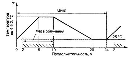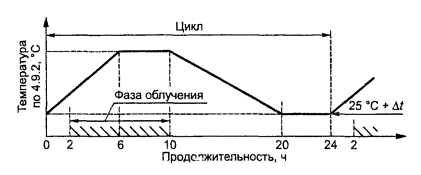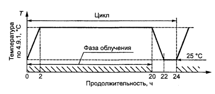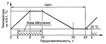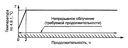 где Тв - верхнее значение температуры при испытании в камере солнечного излучения, °С; Т2 - верхнее значение температуры по таблице 2, °С; Dt - значение превышения температуры изделия над верхним значением температуры воздуха, вычисленное в соответствии с ГОСТ Р 51368 по данным для методов 201-1.2, 201-2.2 и приложения Б. 4.10. Для метода 211-1 выдержку проводят непрерывно в соответствии с рисунком 1, для методов 211-2 - 211-4 - циклами. Продолжительность каждого цикла - 24 ч. Изменение температуры и режим излучения - в соответствии с рисунками 2 - 5. Для метода 211-4 в стандартах и ТУ на изделия и ПИ может быть предусмотрено измерение необходимых параметров изделий в процессе испытаний в период совместного воздействия верхнего значения температуры и солнечного излучения. Для метода 211-5 испытание проводят путем проверки изделий на теплоустойчивость методами 201-1.1 или 201-2.1 и 201-2.2 по ГОСТ Р 51368 со следующими изменениями и дополнениями: - выдержку проводят в камере солнечного излучения; - верхнее значение температуры воздуха в камере устанавливают в соответствии с 4.9.1; - режимы изменения температуры и излучения устанавливают, как правило, как для метода 211-2. Однако если продолжительность измерения параметров изделия, предусмотренного для методов 201-1 и 201-2, превышает продолжительность совместного воздействия верхнего значения температуры и излучения, применяют режимы изменения температуры и излучения как для метода 211-3. Метод 211-5 можно применять как начальную стадию испытаний изделий по методам 211-1 - 211-4 или как самостоятельный вид испытаний. Режим облучения и зависимость температуры от времени Рисунок 1 - Метод 211-1. Рисунок 2 - Метод 211-2.