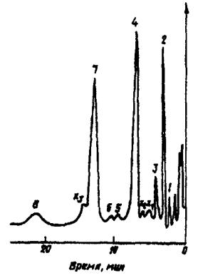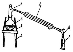 8. Химические исследования вытяжек8.1. Спектрофотометрический метод определения стирола в модельных средах, имитирующих пищевые продукты (вода, 2 %-ный раствор уксусной кислоты, 0,3 %-ный раствор молочной кислоты)Метод основан на дистилляции летучей части вытяжки и измерении оптической плотности полученного дистиллята на спектрофотометре при l=247 нм. Предел обнаружения стирола 0,01 мг/дм3. Относительная ошибка определения составляет ±20 %. Этилбензол в концентрации до 5 мг/дм3 не мешает определению. Реактивы и растворы Стирол, ГОСТ 10003-90, перегнанный. Спирт этиловый ректификованный технический, ГОСТ № 18300-87, 96 %-ный, перегнанный. Основной стандартный раствор стирола в этиловом спирте. Для приготовления раствора в мерную колбу, вместимостью 25 см3, вносят 10-15 см3 этилового спирта и взвешивают с точностью до 0,0002 г. После добавления 4-5 капель стирола мерную колбу вновь взвешивают и доводят объем раствора до метки этиловым спиртом. Концентрацию стирола в растворе (мг/см3) находят путем деления разности двух взвешиваний на объем мерной колбы. Рабочие стандартные растворы стирола концентрацией 0,1 и 0,01 мг/см3 готовят перед определением путем соответствующего разбавления основного раствора этиловым спиртом. Приборы и посуда Перегонная установка на шлифах Колбы мерные, ГОСТ 1770-74Е, вместимостью 25 см3. Пипетки, ГОСТ 1770-74Е, вместимостью 1, 2, 5 и 10 см3. Цилиндры мерные, ГОСТ 1770-74Е, вместимостью 100 и 200 см3. Спектрофотометр СФ-16 или другого типа с областью измерения от 190 нм. Черт. 1. Перегонная установка на шлифах 1 - электроплитка; 2 - асбест; 3 - колба со шлифом по ГОСТу 25336-82Е; 4 - насадка по ГОСТу 25336-82E; 5 - холодильник по ГОСТу 25336-82Е; б - алонж по ГОСТу 25336-82Е; 7 - цилиндр мерный по ГОСТу 1770-74Е. Построение градуировочного графика В ряд круглодонных колб, вместимостью 500 см3, вносят по 200 см3 модельного раствора и стандартный раствор стирола (концентрацией 0,01 и 0,01 мг/дм3) с таким расчетом, чтобы содержание стирола в последующих пробах составляло 0; 0,002; 0,005; 0,007; 0,010; 0,020 мг. Перемешивают содержимое каждой колбы и соединяют ее с прямым холодильником с помощью съемной насадки Вюрца. Затем отгоняют 25 см3 дистиллята и измеряют его оптическую плотность на спектрофотометре при l=247 нм в цилиндрических кюветах с рабочей длиной 50 мм на фоне дистиллята, отогнанного из 200 см3 модельного раствора, не содержащего стирол. При построении градуировочного графика по оси ординат откладывают оптическую плотность (Д), по оси абсцисс - концентрацию стирола (С) в пересчете на 1 дм3 вытяжки. Ход определения В круглодонную колбу, вместимостью 500 см3, вносят 200 см вытяжки из полистирольного пластика, отгоняют 25 см3 дистиллята и измеряют его оптическую плотность, как указано выше. В качестве эталона сравнения используют дистиллят, отогнанный из контрольного модельного раствора, не бывшего в контакте с полистиролом. Концентрацию стирола в пробе (С, мг/дм) находят по градуировочному графику Д=f(С) зависимости оптической плотности от концентрации мономера. 8.2. Спектрофотометрический метод определения стирола, акрилонитрила и метилметакрилата в водных вытяжках из сополимеров стирола с акрилонитрилом или с метилметакрилатомМетод заключается в дистилляции летучей части вытяжки и измерении плотности полученного дистиллята на спектрофотометре при l 195, 203 и 247 нм. Предел обнаружения стирола - 0,005 мг/дм3, метилмета