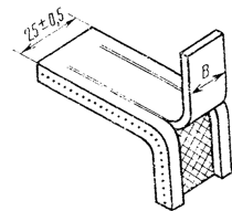 повышают давление до испытательного, равного На рукаве не должно быть разрывов, просачивания воды в виде росы и местных вздутий. Испытания проводят на стенде, аттестованном по ГОСТ 24555-81. Давление контролируют манометром по ГОСТ 2405-88: для рабочего давления 0,63 МПа диапазон измерения от 0 до 4, класс точности 1,5, для рабочего давления 2,0 и 4,0 МПа диапазон измерения от 0 до 16 МПа, класс точности 1,5. Время контролируют секундомером по ГОСТ 5072-79 3-го класса точности или сигнальными часами. 4.5. Для определения прочности рукавов при разрыве гидравлическим давлением от каждого из отобранных рукавов отрезают по одному образцу длиной не менее 2 м и испытывают по методу, указанному в п. 4.4, плавно повышают давление до значения 3Р. Для определения прочности рукавов при разрыве гидравлическим давлением допускается использовать образцы, прошедшие испытания на герметичность по п. 4.4. Испытания проводят на стенде, аттестованном по ГОСТ 24555-81. Давление контролируют манометром по ГОСТ 2405-88: для рабочего давления 0,63 МПа диапазон измерения от 0 до 4, класс точности 1,5, для рабочего давления 2,0 и 4,0 МПа диапазон измерения от 0 до 16 МПа, класс точности 1,5. Время контролируют секундомером по ГОСТ 5072-79 3-го класса точности или сигнальными часами. 4.4, 4.5. (Измененная редакция, Изм. № 2, 4). 4.7. Прочность связи между элементами рукава испытывают по ГОСТ 6768-75. Для испытания вырезают из каждого отобранного рукава в продольном направлении один образец на расстоянии не менее 100 мм от конца. Для рукавов внутренним диаметром свыше 10 мм ширина образца должна быть (15,0 ± 0,5 мм). Допускается заготовлять образец шириной (25,0 ± 0,5) мм и симметрично надрезать наружный слой в продольном направлении (черт. 1), соблюдая указанную ширину. Ширину образца измеряют линейкой по ГОСТ 427-75. Прочность связи между элементами рукава для рукавов внутренним диаметром до 10 мм не определяют, а обеспечивается технологией изготовления. Черт. 1 (Измененная редакция, Изм. № 1, 4). 4.8. Растяжение концов рукавов в радиальном направлении определяют, надевая рукав на коническую оправку с максимальным диаметром, равным наружному диаметру соответствующего ниппеля, или 130 % внутреннего диаметра испытуемого рукава. Отсутствие разрыва проверяют осмотром рукава. 4.9. Для проверки изменения наружного диаметра рукава при минимальном радиусе изгиба от каждого из отобранных рукавов отрезают не менее одного образца длиной 0,7 м и определяют наружный диаметр, изгибая образец рукава на приспособлении, схема которого приведена на черт. 2. Черт. 2 Изменение наружного диаметра (X) рукава при изгибе в процентах вычисляют по формуле