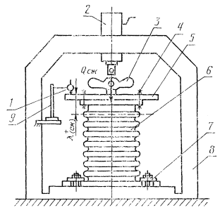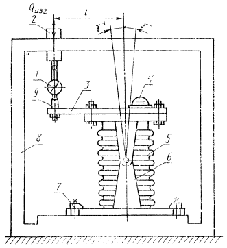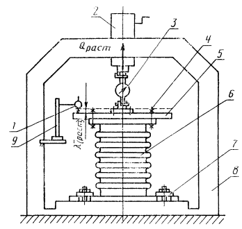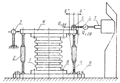 ПРИЛОЖЕНИЕ 6Рекомендуемое ПЕРЕЧЕНЬ СРЕДСТВ ИЗМЕРЕНИЯ, ПРИМЕНЯЕМЫХ ПРИ ПРОВЕРКЕ ПАРАМЕТРОВ И ХАРАКТЕРИСТИК СИЛЬФОННЫХ КОМПЕНСАТОРОВ И УПЛОТНЕНИЙ1. Индикаторы часового типа ИЧ первого класса точности - для измерения линейных перемещений. 2. Оптические квадранты типов КО-1М и КО-3М - для измерения угловых перемещений. 3. Динамометры типов ДОР и ДОС второго класса точности - для измерения усилий. 4. Манометры типов МОШ и МТИ не ниже первого класса точности - для измерения гидравлического давления. 5. Датчики-акселерометры типа КД - для измерения виброперемещений (виброускорений). 6. Датчики-акселерометры - для измерения амплитуд ударных ускорений. 7. Электронные частотомеры типов Ч3-33, Ч3-36 и др. - для измерения частоты вибраций. 8. Электронные или механические часы различных типов - для измерения текущего времени выполнения процесса испытаний (в часах, минутах, секундах). 9. Электронные или механические счетчики - для регистрации количества циклов нагружения образцов СК и УП статическим перемещением (количества циклов срабатывания стенда). ПРИЛОЖЕНИЕ 7Рекомендуемое СХЕМЫ ИСПЫТАНИЙОпределение жесткости СК и УП при сжатии 1 - индикатор; 2 - редуктор; 3 - динамометр типа ДОС; 4 - болт крепежный; 5 - балка; 6 - компенсатор сильфонный; 7 - прижим; 8 - стенд; 9 - стойка индикаторная Черт. 1 Определение жесткости СК и УП при растяжении 1 - индикатор; 2 - редуктор; 3 - динамометр типа ДОР; 4 - болт крепежный; 5 - балка; 6 - компенсатор сильфонный; 7 - прижим; 8 - стенд; 9 - стойка индикаторная Черт. 2 Определение угловой жесткости СК и УП поворотного типа 1 - динамометр; 2 - силовой орган; 3 - балка; 4 - оптический квадрант; 5 - компенсатор сильфонный; 6 - стенд; 7 - прижим; 8 - болт крепежный; 9 - серьга Черт. 3 Определение угловой жесткости СК и УП универсального типа 1 - динамометр; 2 - силовой орган; 3 - балка; 4 - оптический квадрант; 5 - компенсатор сильфонный; 6 - шарнир; 7 - прижим; 8 - стенд; 9 - серьга Черт. 4 Определение жесткости при сдвиге СК и УП универсального и сдвигового типов 1 - компенсатор сильфонный; 2 - стяжка (технологическая или штатная); 3 - индикатор; 4 - оснастка; 5 - серьга; 6 - динамометр; 7 - шток силового органа; 8 - болт крепежный; 9 - прижим Черт. 5 Испытания СК и УП на вибропрочность в осевом направлении 1 - стол вибропреобразователя; 2 - жесткая оснастка; 3 - компенсатор сильфонный; 4 - датчики-акселерометры; 5 - устройство статический разгрузки подвижной системы вибровозбудителя; А - амплитуда перемещения стола вибровозбудителя стенда; А1, А2 - амплитуды виброперемещений элементов гофров сильфона Черт. 6 Испытания СК и УП на ударостойкость положение изделия при испытании в направлении оси X положение изделия при испытании в направлении осей Y (Z)