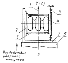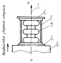где А - амплитуда виброперемещения (виброускорения) точек крепления к столу виброускорителя стенда, мм (м/с2); А1 - амплитуда виброперемещения (виброускорения) элементов конструкции СК (УП) в осевом направлении, мм (м/с2); А2 - то же, в поперечном направлении. Примечания: 1. В пределах всего заданного НТД на данную продукцию диапазона частот могут быть выявлены одна или несколько резонансных частот. 2. Разбивка заданного диапазона частот на полосы частот производится в соответствии с правилами, установленными в отраслевых нормативно-технических документах, в зависимости от конструкции, назначения и области применения СК и УП, если иные требования не предусмотрены НТД на данную продукцию. 3. Разность амплитуд виброперемещений (виброускорений) в двух любых точках одного элемента изделия не должна быть более 15 %. 3.4.3.6. В случае необнаружения резонансов в процессе испытаний по п. 3.4.3.5 изделия подвергают испытаниям на вибропрочность в диапазоне частот, заданном НТД на данную продукцию. Испытания проводят при плавном изменении частоты возмущающих колебаний и при скорости ее непрерывной развертки, обеспечивающей следующую продолжительность испытаний: 2 ч - для осевого воздействия вибрационных нагрузок; 4 ч - для поперечного воздействия вибрационных нагрузок. Во время испытаний допускаются перерывы, но при этом должна сохраняться общая продолжительность испытаний. 3.4.3.7. Образец считают выдержавшим испытания на вибропрочность (п. 3.4.3.6), если после воздействия вибрационных нагрузок он не потерял герметичность и при визуальном осмотре не установлено механических повреждений (трещин, разрушений) его элементов. 3.4.3.8. При обнаружении резонансов в процессе испытаний по п. 3.4.3.5 изделия подвергают испытаниям на вибропрочность на соответствующих резонансных частотах и в тех положениях, при которых они были обнаружены. Испытания по п. 3.4.3.6 в этом случае не проводят. 3.4.3.9. Для изделий, у которых резонансные колебания одной и той же частоты имели место в осевом и поперечном направлениях, испытания по п. 3.4.3.8 проводят только в том положении, при котором амплитуда виброперемещения (виброускорения) была больше. Продолжительность испытаний (выдержки) на каждой обнаруженной резонансной частоте определяют из условия совершения изделием 106 колебаний. Критерий оценки результатов испытаний на вибропрочность на резонансных частотах аналогичен указанному в п. 3.4.3.7. 3.4.4. Испытания образцов изделий - по п. 3.4.1, перечисление 2. 3.4.4.1. Образцы подвергают вибрации аналогично пп. 3.4.2, 3.4.3.1-3.4.3.3, в соответствии с параметрами вибрационного воздействия, приведенными в НТД на данную продукцию: вид вибрации; диапазон частот (с разбивкой на полосы частот); виброускорение; время воздействия вибрации в каждой полосе частот и во всем диапазоне в целом. 3.4.4.2. Образец считают выдержавшим испытания на вибропрочность, если после воздействия вибрационных нагрузок он не потерял герметичность и при визуальном осмотре не установлено механических повреждений (трещин, разрушений) его элементов. 3.5. Методика испытаний на ударостойкость 3.5.1. Сильфонный компенсатор или уплотнение в сборе устанавливают на стенд в соответствии с приложением 7, черт. 7. Изделия, предназначенные для эксплуатации на жидких средах, должны быть заполнены имитатором рабочей среды (средой). Целесообразность прим
