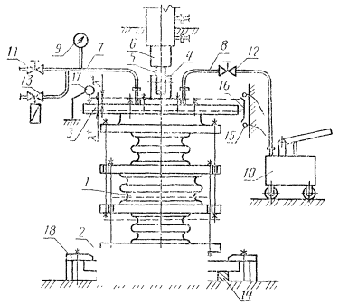 1 - компенсатор сильфонный разгруженного типа; 2 - заглушка нижняя; 3 - заглушка верхняя; 4 - серьга; 5 - переходник; 6 - шток гидроцилиндра; 7, 8 - шланг гибкий; 9 - манометр; 10 - насос; 11, 12 - клапан запорный; 13 - клапан предохранительный; 14 - подставка; 15 - выключатель конечный; 16 - планка нажимная; 17 - индикатор; 18 - прижим Черт. 9 Испытания СК и УП универсального типа по подтверждению вероятности безотказной работы при изгибе (повороте)