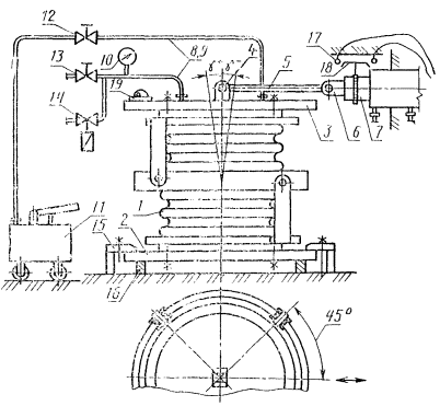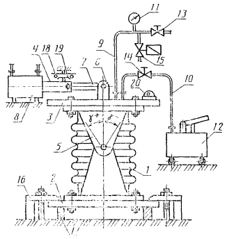 1 - компенсатор сильфонный; 2 - заглушка нижняя; 3 - заглушка верхняя; 4 - шток гидроцилиндра; 5 - шарнир; 6 - вилка; 7 - переходник; 8 - привод; 9, 10 - шланг гибкий; 11 - манометр; 12 - насос; 13, 14 - клапан запорный; 15 - клапан предохранительный; 16 - прижим; 17 - подставка; 18 - выключатель конечный; 19 - планка нажимная; 20 - квадрант оптический Черт. 10 Испытание СК сдвигово-поворотного типа по подтверждению вероятности безотказной работы при изгибе (повороте)