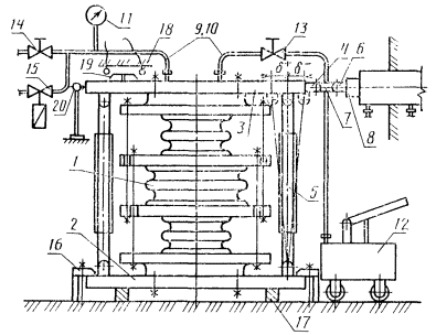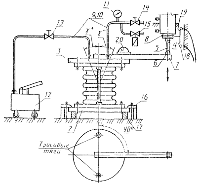 1 - компенсатор сильфонный; 2 - заглушка нижняя; 3 - заглушка верхняя; 4, 6 - серьга; 5 - переходник; 7 - балка; 8 - шток гидроцилиндра; 9, 10 - шланг гибкий; 11 - манометр; 12 - насос; 13, 14 - клапан запорный; 15 - клапан предохранительный; 16 - прижим; 17 - подставка; 18 - выключатель конечный; 19 - планка нажимная; 20 - квадрант оптический Черт. 11 Испытание по подтверждению вероятности безотказной работы сильфонных компенсаторов поворотного типа