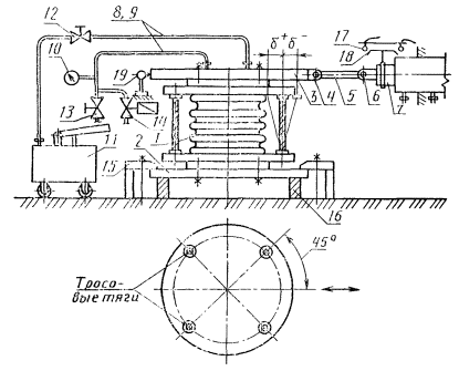 1 - компенсатор сильфонный; 2 - заглушка нижняя; 3 - заглушка верхняя; 4 - вилка; 5 - переходник; 6 - серьга; 7 - шток гидроцилиндра; 8, 9 - шланг гибкий; 10 - манометр; 11 - насос; 12, 13 - клапан запорный; 14 - клапан предохранительный; 15 - прижим; 16 - подставка; 17 - выключатель конечный; 18 - планка нажимная; 19 - квадрант оптический Черт. 12 Испытание СК и УП универсального типа по подтверждению вероятности безотказной работы при сдвиге