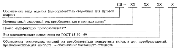 Примечания: 1. Наибольшее значение сварочного тока при ПН = 60 % равно номинальному. Допускается получение сварочного тока, превышающего номинальное значение, но при этом должна быть обеспечена работа преобразователя при ПН ³ 35 %. 2. В эксплуатационной документации должны быть указаны наибольшие значения сварочного тока при ПН = 100 % и ПН = 35 %. 1.2. В технических условиях на преобразователи конкретных типов дополнительно должны быть установлены следующие основные параметры: напряжение холостого хода, коэффициент полезного действия, частота вращения, габаритные размеры, масса. (Измененная редакция, Изм. № 1). 1.3. Структура условного обозначения преобразователя приведена в обязательном приложении. 2. ТЕХНИЧЕСКИЕ ТРЕБОВАНИЯ2.1. Преобразователи должны быть изготовлены в соответствии с требованиями настоящего стандарта и технических условий на преобразователи конкретных типов по рабочим чертежам, утвержденным в установленном порядке, а преобразователи, предназначенные для экспорта в районы с тропическим климатом, - и по ГОСТ 15963-79. 2.2. Преобразователи должны быть передвижными или стационарными. 2.3. Передвижные преобразователи должны быть однокорпусными, а стационарные - однокорпусными или двухкорпусными. 2.4. Преобразователи должны быть изготовлены на номинальное напряжение трехфазной питающей сети 220 и 380 В частотой 50 Гц, а преобразователи, предназначенные для экспорта, - на номинальное напряжение, указанное в заказе-наряде внешнеторговой организации, частотой 50 или 60 Гц. 2.5. Преобразователи на номинальный сварочный ток 500 А должны обеспечивать стабильность рабочего напряжения в пределах ± 3 % номинального значения при колебаниях напряжения питающей сети от плюс 10 до минус 5 % номинального значения. 2.6. Конструкция преобразователей должна быть самовентилируемая. 2.7. Преобразователи должны допускать их прямое включение в сеть. 2.8. Преобразователи должны иметь устройство для включения электродвигателя в сеть. Электрическая износостойкость этих устройств должна быть не менее 16000 переключений. 2.9. В конструкции преобразователей должны быть предусмотрены приспособления для транспортирования с помощью подъемных средств. В конструкции передвижных преобразователей должны быть предусмотрены приспособления для их перемещения и обрезиненные или чугунные колеса, а в конструкции преобразователей, предназначенных для экспорта, - обрезиненные колеса. 2.10. Сопротивление и электрическая прочность изоляции обмоток, механическая прочность при повышенной частоте вращения, предельные превышения температуры нагревающихся частей генераторов, коммутация коллекторных генераторов, сварочные свойства преобразователей и устройство для регулирования сварочного тока - по ГОСТ 304-82. (Измененная редакция, Изм. № 1). 2.15. Номинальные значения климатических факторов внешней среды - по ГОСТ 15543-70 и ГОСТ 15150-69. (Измененная редакция, Изм. № 1). (Введен дополнительно, Изм. № 1). 3. ТРЕБОВАНИЯ БЕЗОПАСНОСТИ3.1. Требования безопасности к конструкции преобразователей и их составных частей - по ГОСТ 12.2.007.8-75. 3.2. Класс преобразователей по способу защиты человека от поражения электрическим током - 01 по ГОСТ 12.2.007.0-75. В конструкции корпуса преобразователей должен быть предусмотрен болт заземления. 3.3. Степень защиты преобразователей - не менее IР22 по ГОСТ 14254-96. 3.4. (Исключен, Из