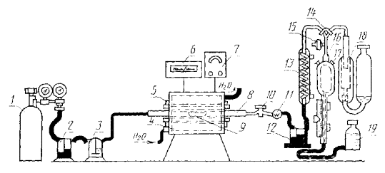 2. ГАЗООБЪЕМНЫЙ МЕТОД2.1. Сущность метода Метод основан на сжигании навески стали или чугуна в токе кислорода при 1250-1350 °С с последующим поглощением образующегося диоксида углерода раствором гидроксида калия (натрия). Массовую долю углерода определяют по разности первоначального объема газа и объема газа, полученного после поглощения диоксида углерода раствором гидроксида калия (натрия). 2.2. Определение углерода с применением эвдиометра со шкалой до 1,5 % углерода Установка для газообъемного определения углерода (см. чертеж), состоящая из баллона с кислородом или кислородопровода, снабженного редукционным вентилем для пуска и регулирования тока кислорода 1; промывной склянки, содержащей раствор марганцевокислого калия с массовой концентрацией 40 г/дм3 в растворе гидроксида калия (натрия) с массовой концентрацией 400 г/дм3 2; промывной склянки с серной кислотой 3 (допускается проводить сухую очистку кислорода); для этого вместо склянок 2 и 3 используют хлоркальциевую трубку, колонку с аскаритом и V-образную трубку, содержащую в первой половине (по ходу газа) асбест, пропитанный диоксидом марганца, а во второй - ангидрон; горизонтальной трубчатой печи с силитовыми нагревателями, обеспечивающей нагрев до температуры 1350 °С 4; металлического кожуха, в который заключена печь 5; терморегулятора типа ПСР или другого подобного типа 6; регулятора напряжения типа РНО-250-10 или другого подобного типа 7; фарфоровой или огнеупорной муллитокремнеземистой трубки длиной 750-800 мм с внутренним диаметром 20-22 мм, концы которой должны выступать из печи не менее чем на 200 мм с каждой стороны 8; лодочки фарфоровой неглазурованной по ГОСТ 9147-80 9; стеклянного крана, с помощью которого регулируют скорость тока кислорода 10; стеклянной трубки (шаровидной или V-образной), заполненной стеклянной или хлопчатобумажной ватой для удержания твердых оксидов, уносимых из печи током кислорода 11; промывной склянки с раствором двухромовокислого калия в серной кислоте, для поглощения сернистого газа (допускается применять в качестве фильтра-поглотителя стеклянную трубку, наполненную диоксидом марганца или гранулами гидроперита) 12; газоанализатора ГОУ-1 или КГА-4, включающего змеевиковый холодильник для охлаждения поступающей из печи газовой смеси (СО2 + О2) 13; двухходового крана, соединяющего эвдиометр с холодильником, поглотительным сосудом и атмосферой 14; одноходового крана, соединяющего эвдиометр с атмосферой 15; эвдиометра 16 общей вместимостью 250 см3. Эвдиометр имеет двойные стенки, пространство между которыми заполняется водой, благодаря чему уменьшается влияние температуры окружающей среды. Здесь же находится пустотелый поплавок, который при заполнении эвдиометра жидкостью поднимается и запирает верхнее отверстие. К узкой части эвдиометра прикреплена подвижная шкала для определения изменения объема газов при сжигании пробы. Шкала соответствует только тому эвдиометру, к которому она прилагается. Перенос ее на другой эвдиометр недопустим. Деление шкалы соответствует процентному содержанию углерода в 1 г исследуемого вещества. Эвдиометры градуированы при температуре 16 или 20 °С и атмосферном давлении 7448 Па (760 мм рт. ст.), поэтому для иных условий вводят поправку на температуру и атмосферное давление по соответствующей таблице, прилагаемой к газоанализатору; терм