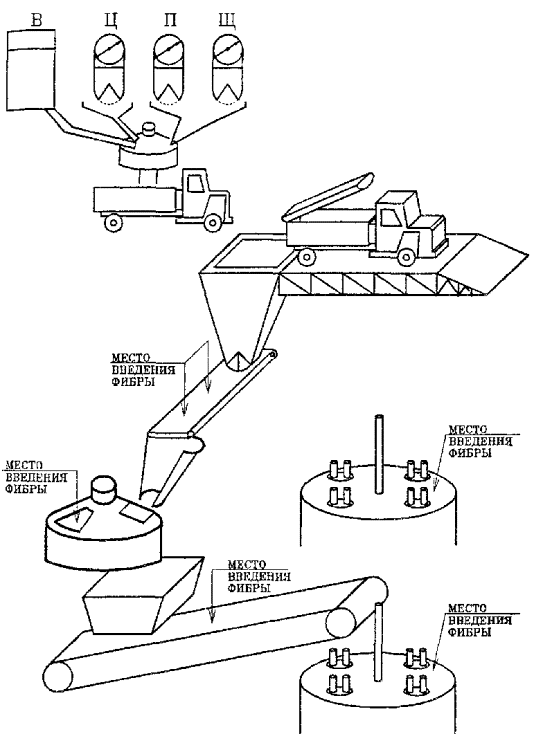 ЧАСТЬ 2. ОСНОВНЫЕ ПОЛОЖЕНИЯ ТЕХНОЛОГИЙ ПРОИЗВОДСТВА ФИБРОБЕТОННЫХ ИЗДЕЛИЙ И КОНСТРУКЦИЙ.2.1. ОБЩИЕ ПОЛОЖЕНИЯ.2.1.1. Настоящие нормы распространяются на технологии и методы изготовления фибробетонных конструкций на основе тяжелого (обычного), мелкозернистого (песчаного) бетонов и следующих видов фибры: - стальной; - из щелочестойкого стекловолокна; - из обычного (алюмоборосиликатного) стекловолокна; - из синтетических волокон. 2.1.2. Указаниями норм следует пользоваться при разработке и использовании технологий производства конструкций, изделий, отдельных элементов и деталей (далее по тексту - конструкции) с фибровым или комбинированным армированием. Фибробетонные конструкции в зависимости от их армирования подразделяются на конструкции: - с фибровым армированием - при их армировании только фибрами какого-либо вида, равномерно распределенными по объему (зоне) элемента; - с комбинированным армированием - при их армировании фибрами, равномерно распределенными по объему (зоне) элемента, в сочетании со стержневой или проволочной арматурой (как в обычном железобетоне в соответствии со СНиП 2.03.01-84 "Бетонные и железобетонные конструкции. Нормы проектирования" [37] и ГОСТ 27006 "Бетоны тяжелые и мелкозернистые. Технические условия" [1]). Фибровая, стержневая или проволочная арматура должна отвечать требованиям соответствующих ГОСТов и Технических условий, приведенных в приложении 2.1 настоящих норм. 2.1.3. К применению должны быть рекомендованы в первую очередь те технологические схемы, методы и оборудование для производства фибробетонных конструкций, при которых реализуется задача максимального использования прочностных свойств фибры и бетона-матрицы с целью достижения наибольшей прочности, плотности и долговечности материала и конструкций при наименьших трудозатратах и материалоемкости. В производстве фибробетонных конструкций предпочтение следует отдавать тем видам материалов и оборудования, которые позволяют повысить степень механизации и автоматизации технологии в заводских или построечных условиях. 2.1.4. При определении рациональных вариантов технологии и организации опытного (опытно-промышленного) производства фибробетонных конструкций следует руководствоваться указаниями раздела 2.3. настоящего документа с целью принятия оптимального решения исходя из конкретных условий производства, возможностей использования недефицитных, эффективных и дешевых исходных материалов и компонентов, а также применения апробированного отечественного или импортного оборудования. 2.1.5. Настоящими нормами производства фибробетонных конструкций предусматриваются следующие виды технологий, определяемые по названию основного технологического приема: - набрызг ("спрей"); - предварительное перемешивание ("премиксинг") с последующим формованием смеси, осуществляемым виброуплотнением, радиальным роликовым формованием, роликовым прессованием, экструзией или иными апробированными методами. 2.1.6. При производстве фибробетонных конструкций должны соблюдаться требования СНиП III-4-93 "Техника безопасности в строительстве", а также требования, изложенные в разделе 2.6 настоящего документа. 2.2. ОБЛАСТИ ПРИМЕНЕНИЯ И ТЕХНОЛОГИИ ПРОИЗВОДСТВА ФИБРОБЕТОННЫХ КОНСТРУКЦИЙ И ИЗДЕЛИЙ.2.2.1. ВИДЫ ФИБРОБЕТОНОВ И ТЕХНИЧЕСКИЕ ТРЕБОВАНИЯ К НИМ.Указания настоящ