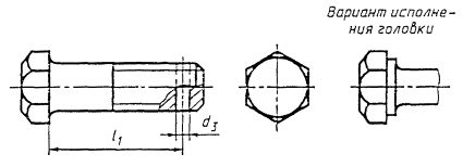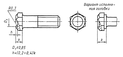 болты исполнений 1 и 2 с лункой на торцевой поверхности головки с размерами, не