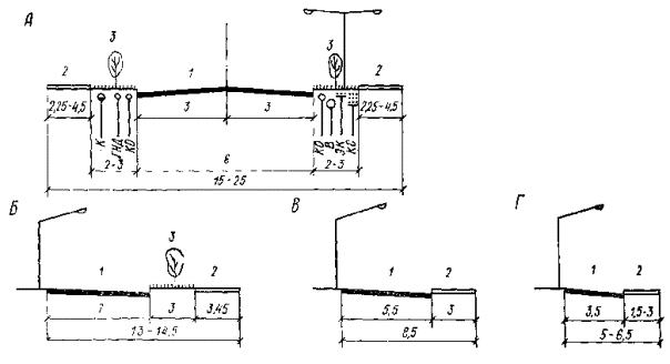 Рис. 7. Типовые поперечные профили жилых улиц и микрорайонных проездов А - жилые улицы; Б - главные проезды; В - основные проезды; Г - подъезды к отдельным зданиям; 1 - проезжая часть; 2 - тротуары; 3 - газоны; ГНД - газопровод низкого давления; КО - кабели освещения; КС - кабели связи; ЭК - электрокабели; В - водопровод; К - канализация