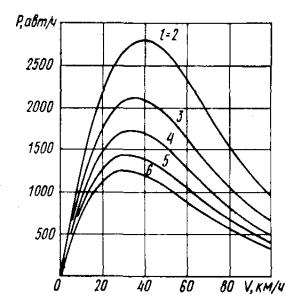 На рис. 10 графически изображена зависимость «скорость потока - пропускная способность полосы движения» при некоторых значениях дистанции безопасности между приведенными автомобилями. 3.5. Переход от интенсивности в физических единицах транспорта Nф, авт/ч, к интенсивности, приведенной к легковому автомобилю Nпр, приведенных авт/ч, и пропускной способности улиц и дорог, приведенной к легковому автомобилю Pпр, приведенных авт/ч, к пропускной способности в физических единицах транспорта Pф, авт/ч, рекомендуется производить по уравнениям: