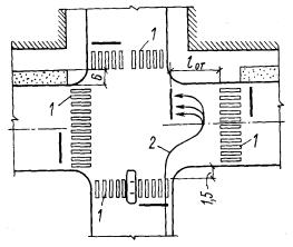 В тех случаях, когда городская улица или дорога проходит по незастроенной и не подлежащей застройке территории, расстояние между пешеходными переходами может быть увеличено с учетом сложившихся направлений пешеходных потоков. Расчет ширины наземного пешеходного перехода производится с учетом расчетной интенсивности пешеходного движения исходя из ширины одной полосы 0,75 м и пропускной способности полосы 800 чел/ч. 6.8. Перекрестки городских улиц и дорог должны быть оборудованы двумя пешеходными переходами или более в зависимости от расположения относительно перекрестка пунктов притяжения пешеходов (жилая застройка, общественные и промышленные объекты, остановочные пункты общественного транспорта и др.), принятой принципиальной схемы организации пешеходного движения и планировки и застройки перекрестка. 6.9. На перекрестках ППОУ следует располагать непосредственно по границе, параллельной проезжей части (рис. 14), если пешеходный переход является продолжением тротуаров, не отделенных от проезжей части разделительными полосами, и имеется одно из следующих условий: пешеходное движение по переходу регулируется пешеходными светофорами; на подходе к перекрестку выделена (при помощи разметки или дорожного знака) специальная полоса проезжей части для движения транспортных средств, совершающих правый поворот с пересечением пешеходного перехода; радиус закругления бордюра менее 8 м. Рис. 14. Схема размещения пешеходных переходов в одном уровне (ППОУ) на перекрестке 1 - пешеходные переходы; 2 - левоповоротное движение, выполняемое с относом пешеходного перехода 6.10. Во всех остальных случаях наземные пешеходные переходы в зоне перекрестков следует располагать с относом от перекрестка. Дальность относа пешеходного перехода от воздушной линии бортов проезжей части, параллельной переходу, должна быть не менее ширины разделительной полосы между проезжей частью и тротуаром и не менее 6 м (рис. 14). В случае применения схемы с удлинением перекрестка для левоповоротного движения (с отнесенным пешеходным переходом) (рис. 14), дальность его относа lот, м, необходимо рассчитывать по формуле