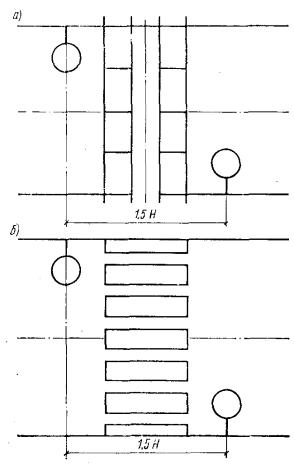 условие 2. Минимальная интенсивность пешеходных потоков. В течение 8 ч (подряд или нет) в рабочий день интенсивность движения транспортных средств и пешеходов не менее следующих величин: 600 ед/ч - для улиц с разделительной полосой 1000 ед/ч по главной улице в двух направлениях; 150 пешеходов переходят эту улицу в одном наиболее загруженном направлении в каждые из тех же 8 ч. Для городов и поселков городского типа с населением менее 10 тыс. человек нормативы по условиям 1 и 2 составляют 70 % указанных; условие 3. Количество дорожно-транспортных происшествий. За последние 12 месяцев на перекрестке совершено не менее трех дорожно-транспортных происшествий (ДТП), подлежащих включению в статистическую отчетность, которые могли бы быть предотвращены при наличии светофорной сигнализации, и хотя бы одно из условий 1 и 2 выполняется по каждому нормативу на 80 % или более; условие 4. Сочетание условий. Ни одно из условий 1 и 2 не выполняется на 100 %, но оба из них выполняются по каждому нормативу на 80 % или более. Рис. 12. Схемы пересечений в одном уровне 5.13. Расчет пропускной способности регулируемых пересечений следует производить согласно разделу 3. Расчет светофорной сигнализации и проектирование других элементов регулирования дорожного движения (дорожные знаки, дополнительные средства информации и разметка проезжей части) следует производить согласно «Руководству по регулированию дорожного движения в городах»/МВД СССР и МЖКХ РСФСР, М.: Стройиздат, 1974. 5.14. Регулируемые пересечения рекомендуется устраивать в виде простых перекрестов без уширения (рис. 12, а) с двухфазным регулированием, если интенсивность левоповоротного движения не превышает двух автомобилей за цикл светофорного регулирования. 5.15. В целях увеличения пропускной способности на регулируемых пересечениях рекомендуется применять следующие транспортно-планировочные решения: пересечение четырех направлений с зоной накопления для левоповоротных автомобилей посередине (рис. 12, б) на широких улицах или дорогах с разделительной полосой при интенсивности левых поворотов от 120 до 150 авт/ч в каждом направлении; пересечение четырех направлений с перекрестно-кольцевым движением транспорта (рис. 12, в, г) с островками разрезного типа как дальнейшее развитие кольцевого саморегулируемого движения, обеспечивающее удобный и безопасный пропуск прямых и поворотных потоков (интенсивность левых потоков от 100 до 200 авт/ч), а также маршрутов общественного транспорта и удобный разворот в обратном направлении; пересечение трех направлений (Т-образное примыкание) с уширением проезжей части и устройством направляющих островков (рис. 12, д) или с устройством кольцеобразного островка по типу «трубы» (рис. 12, е) при интенсивности левых поворотов от 80 до 120 авт/ч. 5.16. На перекрестке со светофорным регулированием, если входные сечения улиц по ширине недостаточны для обеспечения одновременного расчленения транспортного потока на прямой, правоповоротный и левоповоротный, рекомендуется применять пропуск транспортных средств по схеме «несимметричного» перекрестка (рис. 12, ж). По этой схеме выходные сечения улиц по условиям регулирования движения работают попеременно на пропуск того или иного направления. 5.17. В тех случаях, когда на перекрестке не может быть осуществлен пропуск транспортных средств налево за од