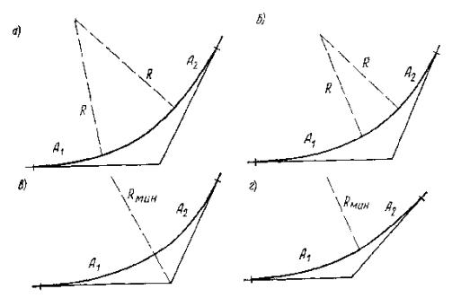 В стесненных условиях и в условиях реконструкции для III класса пересечений допускается принимать расчетную скорость на левоповоротных съездах независимо от величины αл - 30 км/ч, а для IV и V классов - 15 км/ч; на правоповоротных съездах при любых значениях αп - 30 км/ч, а для IV и V классов - 20 км/ч. Для регулируемых левоповоротных и правоповоротных потоков расчетную скорость на съездах следует принимать 10-15 км/ч. Рис. 13. Схемы пересечений в разных уровнях А - пересечения I класса; Б - пересечения II класса; В - пересечения III класса; Г - пересечения IV и V классов 5.26. Минимальные радиусы кривых Rмин, м, на съездах должны соответствовать рекомендуемой расчетной скорости на съездах (табл. 46 и 48) и определяться по формуле