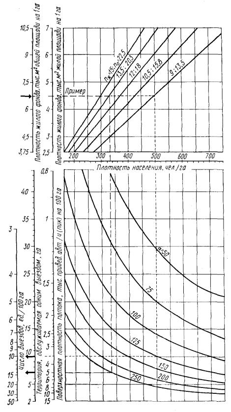 Рекомендуется проектировать улично-дорожные сети со степенью непрямолинейности от очень малой до высокой, а при очень высоких и исключительно высоких показателях следует предусматривать мероприятия по уменьшению непрямолинейности: уплотнение улично-дорожной сети, спрямление отдельных важных направлений, введение диагональных магистралей и т.д. 1.10. Коэффициент непрямолинейности для транспортной сети (линий наземного пассажирского транспорта) определяется так же, как для улично-дорожной сети. При проектировании транспортных сетей следует обеспечивать коэффициент непрямолинейности в среднем не более 1,2, а при связях с главным транспортным узлом - не более 1,15. 1.11 (8.8). Плотность сети магистральных улиц, и дорог на расчетный срок должна приниматься в пределах 2200-2400 м/км2 территории городской застройки. 1.12 (8.11). Затраты времени на передвижение от мест проживания до мест работы для 80-90 % пассажиров (в один конец) не должны превышать 40 мин в крупнейших и крупных городах и не более 30 мин - в остальных городах. Соблюдение этого требования обеспечивается дифференциацией улично-дорожной сети по скоростям с выделением магистралей скоростного и непрерывного движения, а также созданием развитой сети наземного общественного транспорта. 1.13. Линии наземного общественного транспорта следует предусматривать, как правило, на магистральных улицах общегородского и районного значения; в условиях реконструируемых городов для соблюдения норм пешеходной доступности остановок общественного транспорта возможна трассировка 1-2 маршрутов наземного общественного транспорта по жилым улицам. 1.14. (8.12). Расстояния между магистральными улицами, по которым предусматривается пропуск линий пассажирского общественного транспорта, следует принимать 600-800 м, в климатических подрайонах IA, IБ, IГ и IIА - 400-600 м. Длина пешеходных подходов от мест жительства или работы до ближайшей остановки пассажирского общественного транспорта не должна превышать 500 м; указанное расстояние следует уменьшать: в климатических подрайонах IA, IБ, IГ и IIА - до 300 м, а в IV климатическом районе - до 400 м. 1.15. При составлении эскиза конфигурации магистральной улично-дорожной сети города или отдельных планировочных районов следует иметь в виду, что для обеспечения плотности, указанной в п. 1.11, рекомендуется соблюдать следующие положения: в центральных районах городов плотность магистральной улично-дорожной сети может быть увеличена до 3,5-4,5 км/км2; в периферийных жилых районах - до 2,5-3,5 км/км2; плотность улиц и дорог местного значения может составлять 1,25-2 км/км2 застроенной территории проектируемого района. Плотность магистралей различных категорий по отношению к территории городской застройки рекомендуется принимать для: скоростных автомобильных дорог 0,15-0,2 км/км2 при общей плотности всех дорог (включая грузовые дороги и дороги промышленно-коммунальных зон) 0,45-0,7 км/км2; общегородских магистралей непрерывного движения - 0,2-0,3 км/км2; общегородских и районных магистралей регулируемого движения - 1,2-1,6 км/км2. 1.16 (8.2). При расчете пропускной способности сети улиц, дорог и транспортных узлов, а также при размещении площадок для стоянки автомобилей следует принимать уровень автомобилизации на расчетный срок 150-180 легковых автомобилей на 1000 жителей. Примечания: 1. Указанный уровень автомобилизац