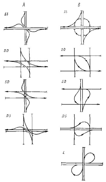 Рис. 24. Номограмма для определения числа выездов из межмагистральной территории nж - норма жилищной обеспеченности, м2 жилой площади на 1 чел.; nо - то же, м3 общей площади на 1 чел.; α - уровень автомобилизации, легковых автомобилей на 1000 чел. ПРИЛОЖЕНИЕ 7ОПРЕДЕЛЕНИЕ ЧИСЛА ВЫЕЗДОВ ИЗ МЕЖМАГИСТРАЛЬНОЙ ТЕРРИТОРИИОпределение числа выездов из межмагистральной территории произведено исходя из предельного потока автотранспорта на любом участке проезда в час пик, при котором обеспечивается безопасный переход пешеходов. Размеры потока автомобильного движения в межмагистральной территории, а значит и число выездов, которые необходимо запроектировать по условиям безопасности пешеходов, зависят от численности проживающего на ней населения (или от плотности жилищного фонда, тыс. м2/га) и от уровня автомобилизации. Для определения числа выездов из межмагистральной территории в различных планировочных условиях следует пользоваться номограммой (рис. 24). Например, в межмагистральной территории с плотностью жилищного фонда 4,5 тыс. м2/га при норме жилищной обеспеченности 9 м2 жилой (или 13,5 м2 общей) площади на одного человека и уровне автомобилизации 125 автомобилей на 1 тыс. жителей необходимо иметь 10 выездов на 100 га (последовательность определения показана на номограмме стрелками), т.е. для территории площадью 70 га необходимо иметь 7 выездов. С помощью номограммы решается и обратная задача, которая возникает в условиях реконструкции: какое население можно расселить в пределах межмагистральной территории с заданным числом выездов, чтобы при определенном уровне жилищной обеспеченности и автомобилизации интенсивность движения на выездах не превышала критического значения. ПРИЛОЖЕНИЕ 8ВЫБОР ТИПА ЛЕВОПОВОРОТНЫХ СЪЕЗДОВ И ГЕОМЕТРИЧЕСКОЙ СХЕМЫ ПЕРЕСЕЧЕНИЙ В РАЗНЫХ УРОВНЯХВыбор типа левоповоротных съездов, определяющих геометрическую схему пересечений, а также вопрос о целесообразности применения в пределах одного и того же пересечения различных типов съездов следует производить с учетом местных планировочных условий и в зависимости от распределения движения по направлениям, причем наименьший перепробег и наибольшие удобства необходимо предусматривать для основных поворотных направлений. Рекомендуется использовать следующие основные типы лево-поворотных съездов (рис. 25), образующиеся путем сочетания различных видов расположения ветвей прямых потоков А и разных типов траекторий левых поворотов Б. Расположения ветвей прямых потоков подразделяются на следующие виды: нераздельное, раздвоенное, частично раздвоенное и перекрестное. Способы ответвления и присоединения траекторий левоповоротных потоков подразделяются на прямое ответвление или примыкание D (DIRECT) и полупрямое ответвление или примыкание S (SEMIDIRECT). В соответствии с этим поворот налево может выполняться ответвлением влево и примыканием слева DD, ответвлением вправо и примыканием справа SS, а сочетание этих элементов образует типы DS или SD. Рис. 25. Элементы геометрических схем и пересечений в разных уровнях А - расположение ветвей прямых потоков; Б - расположение траекторий левых поворотов; а - нераздельное; б - раздвоенное; в - частично раздвоенное; г - перекрестное В отдельную группу поворотов налево выделяется так называемая обратная петля, или «клеверный лист» L (LOOP). По рас