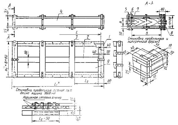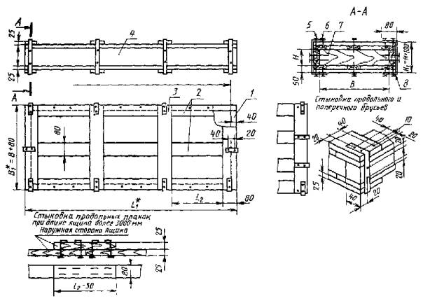 Примечание - При хранении полуфабрикатов в упаковке расконсервация включает и удаление упаковочных средств. ПРИЛОЖЕНИЕ Г(обязательное) ЯЩИКИ ДЛЯ УПАКОВЫВАНИЯ ПОЛУФАБРИКАТОВ1 В зависимости от конструкции и предельной массы полуфабрикатов ящики изготовляют четырех типов: тип I - дощатые решетчатые с четырьмя брусьями, собранными в рамку, с наружными продольными досками и наружными поперечными поясами из досок, скрепленных металлическими скобами (рисунок 1); тип II - дощатые комбинированные с четырьмя брусьями, собранными, в рамку, с наружными продольными досками, наружными поперечными поясами из досок, скрепленных металлическими скобами, дном и крышкой, обшитыми фанерой (рисунок 2); тип III - дощатые решетчатые с плотными торцевыми стенками, с наружными поперечными поясами из планок, скрепленных металлической лентой (рисунок 3); тип IV - дощатые комбинированные с плотными торцевыми стенками, наружными поперечными поясами из планок, скрепленных металлической лентой, с дном, боками и крышкой, обшитыми фанерой (рисунок 4). Ящики типов I и II применяют для упаковывания листов, типов III и IV - для упаковывания профилей, прутков и труб. 2 Размеры ящиков установлены: для типа I - в таблице 1; для типа II - в таблице 2; для типов III и IV - в таблице 3, а их предельные отклонения - в таблице 4. В ящиках типов III и IV применяют планки (рисунки 3, 4, позиции 1, 3, 4, 5) размером 25´50 мм. Допускается применять планки размером 32´40 мм. На каждом конкретном ящике допускается применять планки только одного сечения. 3 Для изготовления ящиков должны применяться пиломатериалы хвойных пород 3-4-го сорта по ГОСТ 8486, ГОСТ 24454 и пиломатериалы лиственных пород 2-3-го сорта по ГОСТ 2695. 4 При отсутствии длинномерного материала при длине ящика более 3000 мм разрешается стыковка продольных брусков, досок и планок. 5 Для