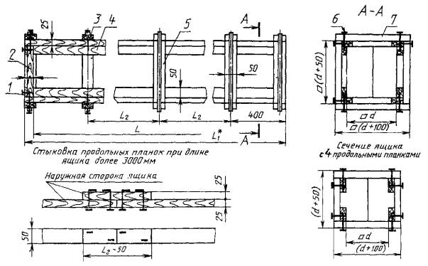 допускается на одной кромке деталей не более При сборке ящиков и щитов кромка детали с обзолом не должна прилегать к фанере или древесноволокнистой плите. 9 Ящики сколачиваются гвоздями типов К4´100 по ГОСТ 4028, К2´40 и К3´70 по ГОСТ 4034, П-образными металлическими скобами, изготовляемыми по НТД, или комбинированным способом (гвоздями и скобами). 10 Крепление угловых соединений с применением брусьев высотой менее 60 мм проводят одним гвоздем. Допускается применять укомины на крайних поясах для ящиков типа III. 11 При сборке дна и крышки с торцевыми и боковыми стенками гвозди забивают: в ящиках типов I и II - по прямой линии, типов III и IV - в шахматном порядке, то есть один гвоздь в планку, другой - в доску. При сборке продольных досок с продольным брусом в ящиках типов I и II расстояние между гвоздями должно быть не более 380 мм при длине ящика до 4000 мм и более 250 мм - при длине более 4000 мм. При сборке ящиков П-образными скобами спинка скобы должна размешаться поперек волокон досок или под углом 30-45° к волокнам прибиваемой детали. Гвозди или скобы должны располагаться от торца планок или досок на расстоянии не менее 15 мм, от продольных кромок - не менее 10 мм. Дно и крышку крепят к боковым щитам между поперечными поясами гвоздями типа К3´70 по ГОСТ 4034 двумя для дна и одним для крышки. 12 При сборке ящиков с применением фанеры гвозди забивают в фанеру. Концы гвоздей должны быть загнуты и утоплены в древесину с наружной стороны ящика. 13 Головки гвоздей не должны выступать или быть утоплены более чем на высоту головки, проволочные скобы должны быть правильной формы, без петель, срезов и других дефектов. 14 Пояса и торцы ящиков должны быть скреплены стальной сплошной лентой или в виде скобы толщиной 0,4-0,8 мм и шириной 20 мм по ГОСТ 3560. 15 Пояса из стальной ленты устанавливают лентообвязочными станками, ручными механическими приспособлениями или ручным способом. Лента при механической обтяжке должна быть плотно натянута на ящике так, чтобы на ребрах она врезалась в древесину. При ручной сплошной обтяжке стальную ленту прибивают гвоздями по торцам ящика с соединением концов внахлестку. 16 Стыковка фанеры в ящиках типов II и IV должна проводиться под поперечными поясами встык или в любом месте внахлест с перекрытием листов фанеры не менее чем на 100 мм. 17 В ящиках типов III и IV при сборке торцевых стенок планки надо прибивать к доскам двумя гвоздями типа К3´70 по ГОСТ 4034 в каждое соединение. 18 Строповку тары проводят в соответствии с приложением Д. 19 Торцевую стенку ящиков типов III и IV допускается изготавливать из цельной доски толщиной 40 мм. 20 Ящики с внутренней стороной квадрата торцевой стенки, равной 300, 350, 400 и 450 мм, допускается изготавливать с четырьмя дополнительными продольными планками. 21 Ящики типов III и IV с торцевой стенкой 100´100, 150´150, 200´200 и 250´250 мм изготавливают на четырех продольных планках. Таблица 1 РАЗМЕРЫ ЯЩИКОВ ТИПА I