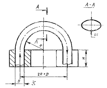где t - время, с; Р - значение испытательного давления, МПа; v - скорость повышения давления, равная 0,175 МПа·с-1 для рукавов с испытательным давлением до 12 МПа и 1,000 МПа·с-1 для рукавов с испытательным давлением, больше или равном 12 МПа. Если для испытуемого рукава давление при испытании на герметичность менее 12 МПа, а на прочность больше или равно 12 МПа, v = 1,000 МПа·с-1. Допускается вырезать образцы для испытаний в направлении нитей усиливающего слоя, прилегающего к испытуемому резиновому слою. Допускается испытывать образец, изготовленный следующим образом: отрезок рукава разрезают в продольном направлении, расправляют и делают два продольных параллельных надреза, полностью прорезая внутренний или наружный резиновый слой; образованную надрезами полоску резинового слоя отделяют от смежных слоев на длину, обеспечивающую надежное закрепление в зажимах машины. Допускается незначительное повреждение нитяного каркаса. Для рукавов внутренним диаметром от 12 до 22 мм включительно ширина образца или полоски должна быть (15,0 ± 0,5) мм, свыше 22 мм - (25,0 ± 0,5) мм. 4.7, 4.8. (Измененная редакция, Изм. № 6). 4.9. Для определения изменения наружного диаметра рукавов при изгибе до минимального радиуса каждый отобранный рукав длиной l = π·(R+D)+2H изгибают на специальном приспособлении, схема которого приведена на черт. 1. Допускается фиксировать конец рукава одеванием его на стержень с наружным диаметром, равным внутреннему диаметру рукава. R - минимально допустимый радиус изгиба рукава; D - диаметр рукава; H - высота приспособления, не менее наружного диаметра рукава Черт. 1 Изменение наружного диаметра рукава при изгибе в процентах вычисляют по формуле