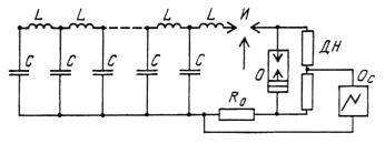С, L - емкости и индуктивности генератора импульсов тока большой длительности соответственно; И - управляемый искровой промежуток; Rо - шунт для измерения тока; О - испытуемый образец или разрядное сопротивление; ДН - делитель напряжения; Ос - осциллограф