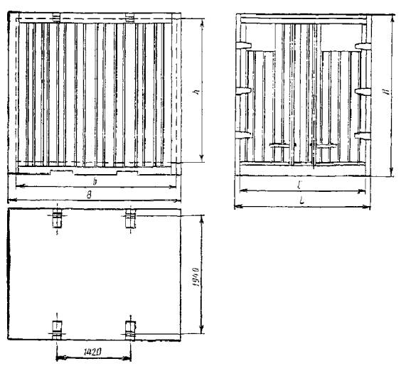Черт. 3 Примечание. Применение контейнера УУК-5 с угловыми фитингами допускается только при наличии согласия транспортных министерств, участвующих в их перевозках. Среднетоннажные контейнеры УУК-5У, УУКП-3(5), УУК-3(5) и УУК-3 Черт. 4 Среднетоннажные контейнеры УУК-5У, УУКП-3(5), УУК-3(5) и УУК-3 Черт. 5 Черт. 4 и 5. (Измененная редакция, Изм. № 1, 3). Малотоннажные контейнеры АУК-1,25 и АУК-0,625 Черт. 6 (Измененная редакция, Изм. № 3). 2.3. При наличии у контейнеров типоразмеров УУК-5У, УУКП-3(5), УУК-3(5) и УУК-3 боковой двери (черт. 4) вместо торцовой ширина и высота дверного проема должны быть равны внутренним длине и высоте этих контейнеров. Если такое равенство обеспечить невозможно, то ширина бокового дверного проема у контейнеров всех указанных типоразмеров должны быть не менее 1950 мм, а высота - не менее 2090 мм у контейнеров типоразмеров УУК-5У, УУК-3(5), УУК-3 и не менее 2280 мм - у контейнера типоразмера УУКП-3(5). Размеры бокового дверного проема контейнеров типоразмеров УУКП-5(6), УУКП-5, УУК-5(6) и УУК-5 устанавливаются транспортными министерствами. (Новая редакция, Изм. № 3). 2.4. Размеры угловых, фитингом и их расположение на крупнотоннажных контейнерах - по ГОСТ 20527-82. 2.5. Размеры и расположение рымных узлов закрытых среднетоннажных контейнеров - по ГОСТ 18579-79 и приведенным на черт. 2-5, открытых среднетоннажных - по утвержденной конструкторской документации, автомобильных малотоннажных - по ГОСТ 22225-76. (Новая редакция, Изм. № 3). 2.6. При оборудовании угловыми фитингами контейнеров типоразмера УУК-5 их расположение должно соответствовать указанному на черт. 3. Разница между расстояниями, замеренными между центрами отверстий диагонально противоположных угловых фитингов, не должна превышать 5 мм. 2.7. Размеры и размещение закрытых снизу вилочных проемов у контейнеров типоразмеров 1CC, 1C, 1СХ, 1D и 1 DX с торцевыми дверями должны соответствовать указанным на черт. 7 и в табл. 4. При наличии у контейнеров типоразмеров 1CC, 1C и 1СХ второй пары вилочных проемов расстояние между их вертикальными осями должно соответствовать указанному на черт. 7 и в табл. 4. Ширина и высота открытых снизу вилочных проемов и расстояние между их вертикальными осями у среднетоннажных контейнеров должны быть одинаковыми у контейнеров всех типоразмеров и соответственно составлять 300, 100 и 950 мм. Примечания: 1. Вторая внутренняя пара вилочных проемов у контейнеров типоразмеров 1CC, 1C и 1СХ предназначена для использования только при подъеме порожних контейнеров. 2. Крупнотоннажные контейнеры с боковыми дверями вилочными проемами не оборудуются. (Измененная редакция, Изм. № 3).