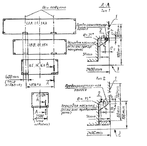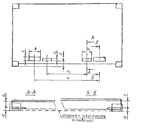 1 - часть стенки, включая выступающие заклепки и головки болтов, не должна отстоять от внутренней грани предохранительной полосы (планки, кромки) более чем на 12-2 мм; 2 - полка балки в зоне контакта с лапой захвата должна быть плоской и горизонтальной и образовывать с предохранительной полосой прямой угол; 3 - нижняя поверхность нижних угловых фитингов Черт. 8 (Измененная редакция, Изм. № 3). Примечание. Размеры и размещение подхватных устройств в основании контейнеров типоразмеров 1AX, 1СХ, 1DХ такие же, как соответственно у контейнеров типоразмеров 1АА (1А), 1СС (1C) и 1D. 1 - поверхность торцовой стенки; 2 - нижняя поверхность поперечных элементов основания Черт. 9 Примечания: 1. Высоту паза Н проверяют на расстоянии 600 мм от его конца. 2. Опорные поверхности паза могут быть сплошными с минимальной длиной, приведенной в табл. 5, и иметь сечение, показанное на чертеже жирными линиями или состоять из отдельных площадок, отвечающих требованиям ГОСТ 20259-80. Таблица 5 Размеры мм