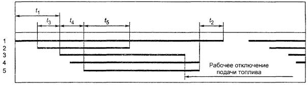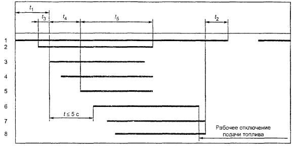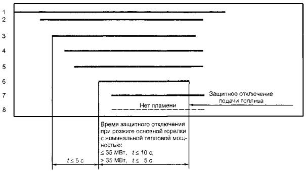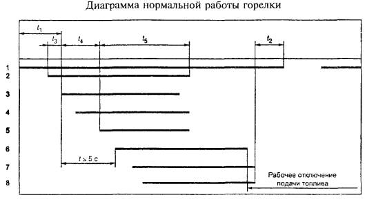 t1 - время предварительной продувки; t2 - время последующей продувки; t1 + t2 - время продувки; t3 - время предзажигания; t4 - время собственно зажигания; t5 - время после зажигания; t3 + t4 + t5 - полное время зажигания; t6 - время реагирования на погасание пламени