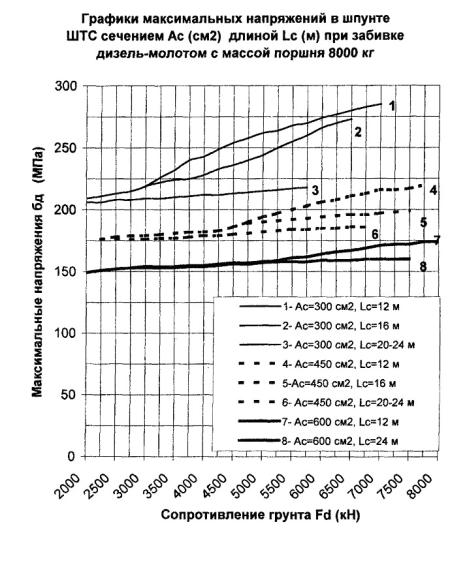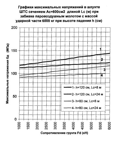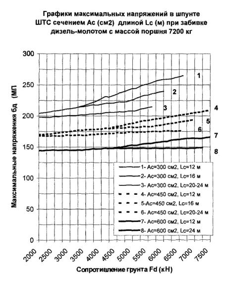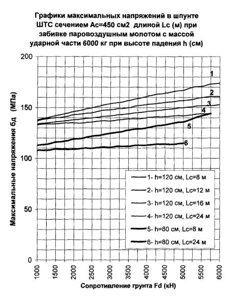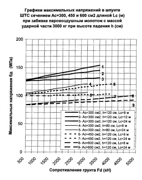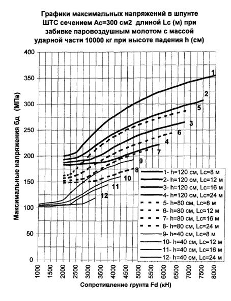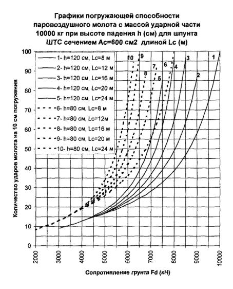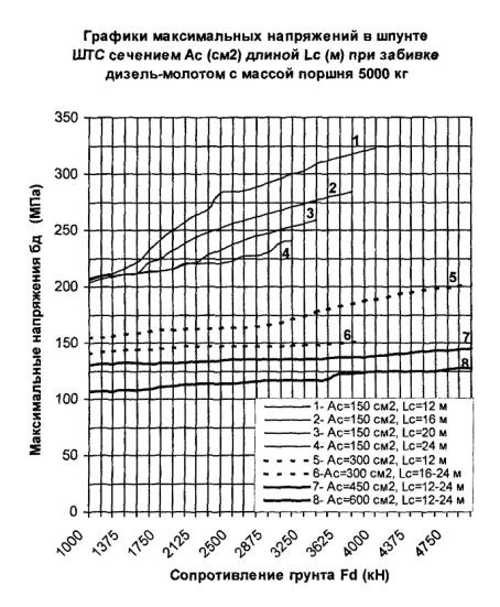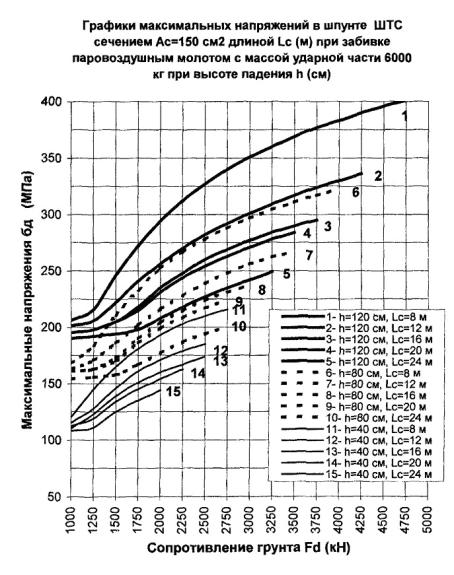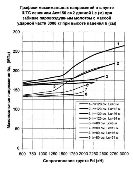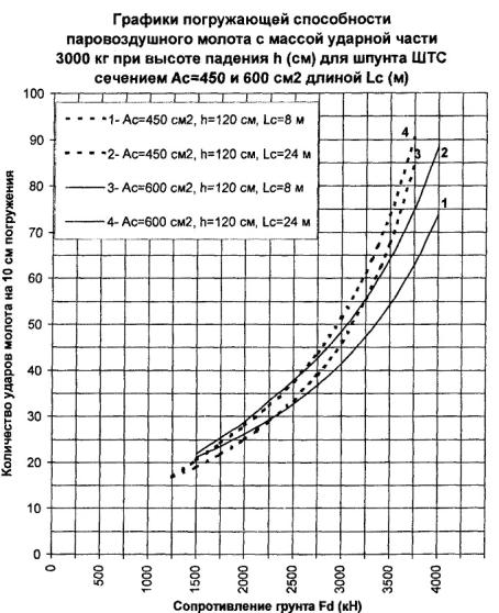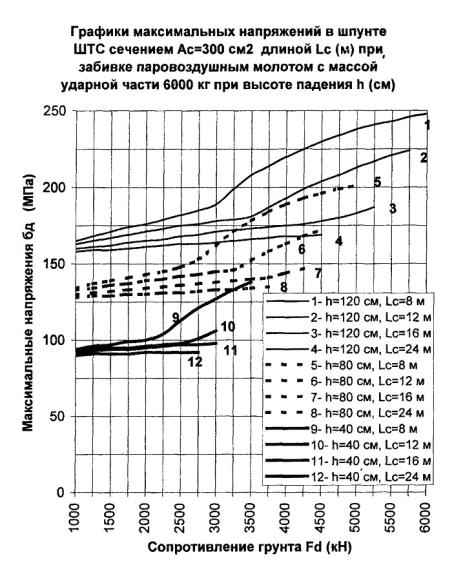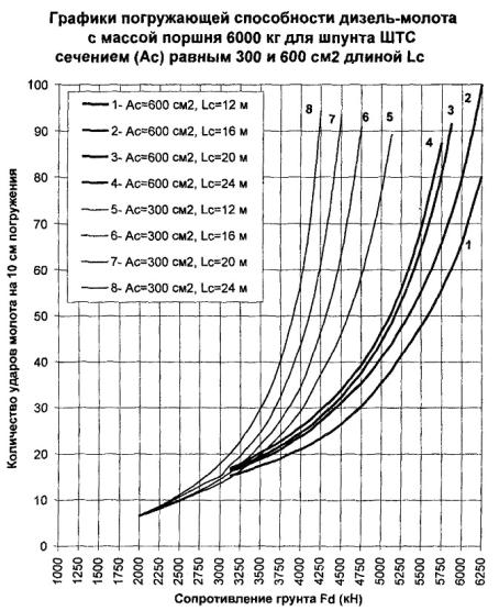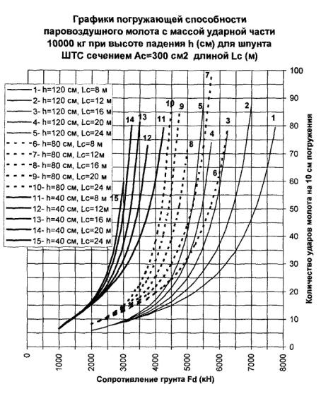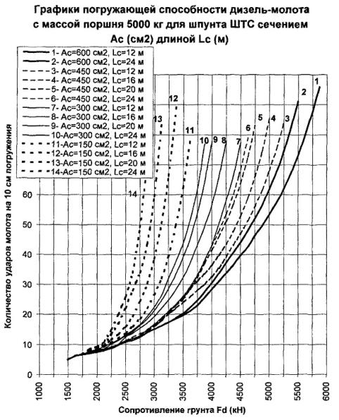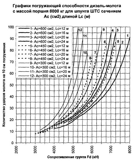 300 см2, длине 24 м и сопротивлении погружению Fd = 3000 кН погружающая способность молота с поршнем 5000 кг согласно