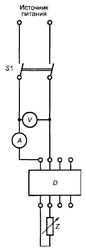где р - число фазовых полюсов; k - номер полюса; ΔU - падение напряжения, В; I - испытательный ток, который должен быть равен In в пределах допусков по 8.3.2.2.2, А; cos φ - коэффициент мощности. Рекомендуется использование на каждом полюсе ваттметра. G.2.2 Для выключателей переменного тока на номинальный ток не более 400 А допустимо измерение с использованием однофазного переменного тока без измерения коэффициента мощности. Потери мощности вычисляют по формуле (соединения по рисунку G.2)