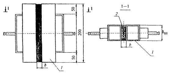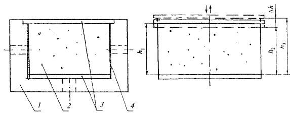 где Рmax - максимальное усилие при отрыве или разрушении образца, кгс. S - площадь поперечного сечения образца, см2. За результат испытаний принимают среднеарифметическое значение результатов испытаний образцов. 7.6.9 Деформационную устойчивость монтажного шва определяют по максимальной величине его деформации под воздействием силы, направленной перпендикулярно к плоскости монтажного шва, при которой сохраняется его целостность. В обоснованных случаях допускается проводить этот вид испытаний монтажного шва на пенном утеплителе. Число образцов для испытаний - не менее трех. 7.6.9.1 Аппаратура и приспособления Машина разрывная, обеспечивающая разрушение образца со скоростью движения активного захвата (10 ± 1) мм/мин и позволяющая устанавливать значение разрушающего усилия с погрешностью не более 1 %. Специальное приспособление с обоймой для размещения образцов монтажного шва. Приспособление при проведении испытаний должно обеспечивать совпадение поперечной оси образца с направлением прилагаемого усилия (рисунок 4). Специальное устройство для подготовки образцов пенного утеплителя и их установки в испытательной машине (схема устройства представлена на рисунке 4а). 7.6.9.2 Образцы для испытаний Образцы монтажного шва для проведения испытаний получают путем послойного заполнения обоймы специального приспособления изоляционными материалами в соответствии с проектно-конструкторским решением и технологией производства монтажных работ (рисунок 4). b - толщина шва; 1 - обойма из алюминия или нержавеющей стали толщиной 3 мм; 2 - образец испытываемого монтажного шва Рисунок 4 - Схема приспособления для испытания монтажных швов на деформационную устойчивость I - положение пластин при заданной (начальной) толщине образца (h1); II - положение пластин при наибольшем сжатии образца (h2); III - положение пластин при наибольшем растяжении образца (h3); 1 - корпус устройства; 2 - образец материала; 3 - алюминиевые пластины толщиной не менее 2,0 мм; 4 - смазка Рисунок 4а - Схема устройства для подготовки образцов и испытания пенного утеплителя на деформационную устойчивость Образцы пенного утеплителя для проведения испытаний получают путем заполнения им корпуса устройства, представленного на рисунке 4а. Внутренний диаметр корпуса, определяющий размер образца - (60 + 0,2) мм, высота внутренней полости корпуса - 30 мм (без учета толщины ограничительных пластин). Внутренняя поверхность корпуса должна быть смазана консистентной смазкой. На дно корпуса устройства до заливки пены устанавливают алюминиевую пластину диаметром (60 - 0,2) мм. Вторую пластину диаметром (65 - 0,5) мм устанавливают в верхней части корпуса в виде крышки и жестко фиксируют любым способом. Заливку пены производят в отверстие диаметром 8 мм в боковой стенке корпуса. Для удаления излишка пены предусматривают такое же отверстие с другой стороны корпуса. После заливки пены образец выдерживают не менее суток, после чего образец вынимают из корпуса. 7.6.9.3 Порядок проведения испытания Обойму с образцом монтажного шва (или образец пенного утеплителя, представляющий собой цилиндр отвердевшей пены, зажатый между двумя алюминиевыми пластинами) устанавливают в захватах машины. Испытание проводят при температуре (20 ± 2) °С путем последовательных растяжений и сжатий образца. Величину растяжения и сжатия в миллим