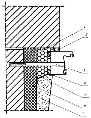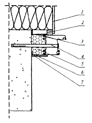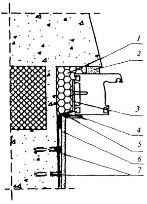 1 - элемент отделки наружного оконного откоса; 2 - изоляционная саморасширяющаяся паропроницаемая лента; 3 - водоизоляционная паропроницаемая лента; 4 - рамный дюбель; 5 - пенный утеплитель; 6 - пароизоляционная лента; 7 - декоративный нащельник Рисунок А.8 - Узел бокового примыкания оконного блока к проему стены из бетона с наружным утеплением фасада и установкой внутреннего декоративного нащельника