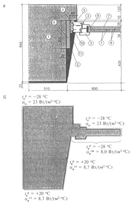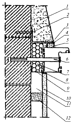 1 - подоконная доска; 2 - пенный утеплитель; 3 - пароизоляционная лента; 4 - гибкая анкерная пластина; 5 - опорная колодка под подоконную доску; 6 - штукатурный раствор; 7 - дюбель со стопорным шурупом; 8 - вкладыш из антисептированного пиломатериала; 9 - водоизоляционная паропроницаемая лента; 10 - шумопоглощающая прокладка; 11 - слив; 12 - изоляционная саморасширяющаяся паропроницаемая лента Рисунок А.4 - узел нижнего примыкания оконного блока, подоконника и слива к проему слоистой стены с эффективным утеплителем