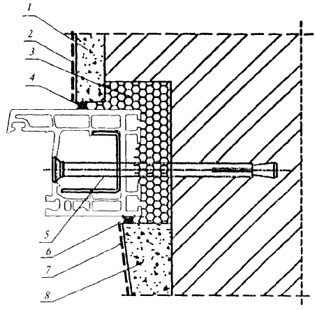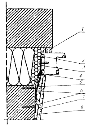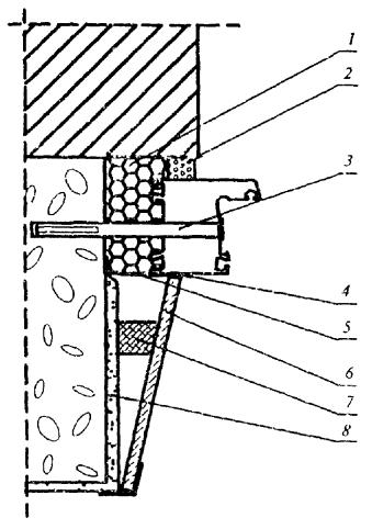 1 - изоляционная саморасширяющаяся паропроницаемая лента; 2 - пенный утеплитель; 3 - гибкая анкерная пластина; 4 - герметик; 5 - пароизоляционная лента; 6 - дюбель со стопорным шурупом; 7 - штукатурный слой внутреннего откоса (с фаской для слоя герметика); 8 - армирующая сетка Примечание - В том случае если теплотехнические расчеты не подтверждают требуемую температуру поверхностей внутренних откосов, рекомендуется применение оконных блоков с расширенной коробкой или увеличение размеров наружной четверти при помощи конструкционных материалов Рисунок А.3 - Узел бокового примыкания оконного блока к проему с четвертью слоистой стены из кирпича с эффективным утеплителем и отделкой внутреннего откоса штукатурным раствором
