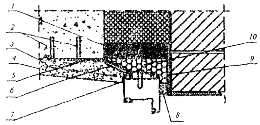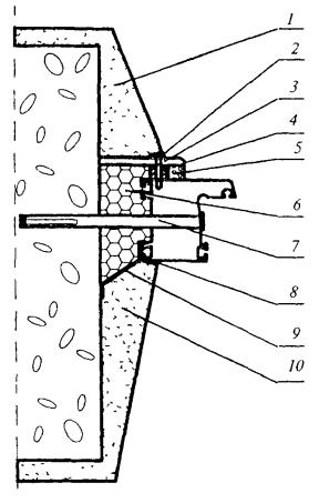 1 - пенный утеплитель; 2 - изоляционная саморасширяющаяся паропроницаемая лента; 3 - рамный дюбель; 4 - герметик; 5 - пароизоляционная лента; 6 - панель отделки внутреннего откоса; 7 - рейка; 8 - штукатурный выравнивающий слой внутреннего откоса Рисунок А.6 - Узел бокового примыкания оконного блока к проему с четвертью в стене из ячеистобетонных блоков (плотностью 400 - 450 кг/м3) с облицовкой кирпичом и отделкой внутреннего откоса панелью 1 - штукатурный слой наружного откоса (с фаской для слоя герметика); 2, 8 - герметик; 3 - нащельник; 4 - дистанционная прокладка (шайба); 5 - изоляционная саморасширяющаяся паропроницаемая лента; 6 - пенный утеплитель; 7 - рамный дюбель; 9 - пароизоляционная лента; 10 - штукатурный слой внутреннего откоса (с фаской для слоя герметика) Рисунок А.7 - Узел бокового примыкания оконного блока к проему без четверти в стене из ячеистобетонных блоков с отделкой фасада, наружных и внутренних откосов штукатурным раствором