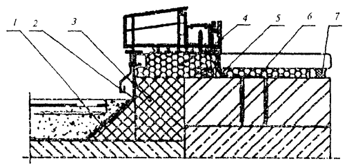 1 - водоизоляционная лента; 2 - водоизоляционная паропроницаемая лента; 3 - вкладыш из материала с низкой теплопроводностью; 4 - пенный утеплитель; 5 - пароизоляционная лента; 6 - гибкая анкерная пластина; 7 - герметик Рисунок А.11 - Монтажный шов в нижнем узле примыкания коробки балконной двери