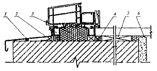 1 - шумопоглощающая прокладка; 2 - водоизоляционная паропроницаемая лента; 3 - пенный утеплитель; 4 - пароизоляционная лента; 5 - несущая опорная колодка; 6 - герметик Рисунок А.12 - Монтажный шов в нижнем узле примыкания оконной коробки, подоконника и отлива в проеме однослойной стены