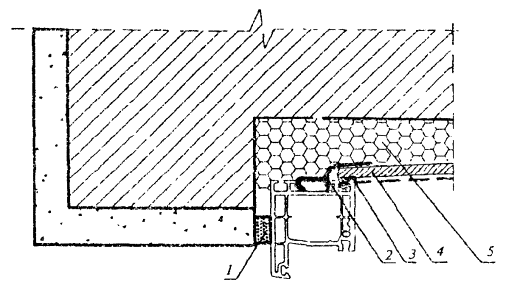 1 - изоляционная саморасширяющаяся паропроницаемая лента; 2 - дополнительный профиль; 3 - герметик; 4 - влагостойкий гипсокартон с пароизоляционным покрытием; 5 - пенный утеплитель Рисунок A.13 - Узел бокового и верхнего примыкания оконного блока к проему стены с четвертью и отделкой внутреннего откоса панелями