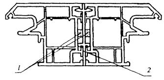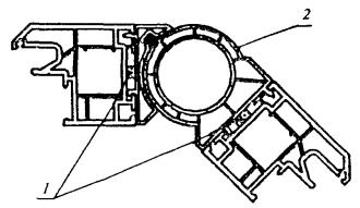 1 - изоляционная саморасширяющаяся паропроницаемая лента; 2 - соединитель Рисунок А.15 - Узел соединения оконных коробок