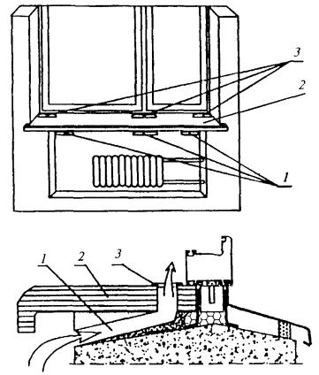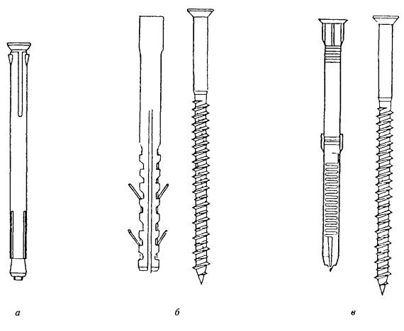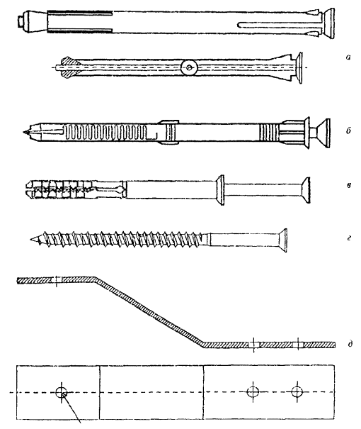 1 - канал подачи теплого воздуха от нагревательного прибора к оконному блоку (штроба в стяжке из штукатурного раствора); 2 - подоконная доска; 3 - декоративная решетка выходного отверстия Рисунок А.17 - Схема нижнего узла примыкания с каналом подачи теплого воздуха от нагревательного прибора к оконному блоку ПРИЛОЖЕНИЕ Б(рекомендуемое) Требования к крепежным элементам и их установкеБ.1 Крепежные элементы предназначены для жесткой фиксации оконных блоков к стеновым проемам и для передачи ветровых и других эксплуатационных нагрузок на стеновые конструкции. Б.2 Для крепления оконных коробок к стеновым проемам, в зависимости от конструкции стены и прочности стеновых материалов, применяют различные универсальные и специальные крепежные элементы (детали и системы), рисунок Б.1: - распорные рамные (анкерные) дюбели металлические или пластмассовые, в комплекте с винтами. Винты могут иметь потайную или цилиндрическую головку; - универсальные пластмассовые дюбели со стопорными шурупами; - строительные шурупы; - гибкие анкерные пластины. Винты, шурупы и пластины изготавливают из нержавеющей стали или стали с антикоррозионным цинковым хроматированным покрытием толщиной не менее 9 мкм. Крепление оконных коробок и анкерных пластин к стеновым проемам на гвоздях не допускается. При необходимости крепления оконного блока к стенам из материалов низкой прочности допускается использование специальных полимерных анкерных систем. Распорные пластмассовые рамные дюбели применяют в агрессивных средах с целью предотвращения контактной коррозии, а также с целью термоизоляции соединяемых элементов. а - металлический рамный дюбель; б - пластмассовый рамный дюбель; в - универсальный пластмассовый дюбель со стопорным шурупом; г - строительные шурупы; д - гибкая анкерная пластина Рисунок Б.1 - Примеры крепежных элементов Длину дюбелей определяют расчетом в зависимости от эксплуатационных нагрузок, размера профиля коробки оконного блока, ширины монтажного зазора и материала стены (глубина заделки дюбеля в стену должна быть не менее 40 мм в зависимости от прочности стенового материала). Диаметр дюбеля определяют расчетом в зависимости от эксплуатационных нагрузок; в общем случае рекомендуется применять дюбели диаметром не менее 8 мм. Материал дюбеля - конструкционный полиамид по НД. Для изготовления шурупов и винтов применяют стали с временным сопротивлением разрыву не менее 500 Н/мм2. Б.4 Несущую способность рамных дюбелей (допустимые нагрузки на вырыв) принимают по технической документации изготовителя. Справочные значения несущей способности (допускаемых нагрузок на вырыв и срез) рамных распорных дюбелей диаметром 10 мм приведены в таблице Б.1. Б.5 Пластмассовые дюбели со стопорными шурупами применяют для крепления оконных блоков к стенам из кирпича с вертикальными пустотами, пустотелых блоков, легких бетонов, дерева и других строительных материалов с невысокой прочностью на сжатие. Длину и диаметр пластмассовых дюбелей со стопорными шурупами принимают аналогично Б.3. Для крепления оконных блоков к монтажным деревянным закладным элементам и черновым коробкам допускается применение строительных шурупов. Б.6 Гибкие анкерные пластины применяют для крепления оконных блоков к многослойным стенам с эффективным утеплителем. Крепление на гибкие а