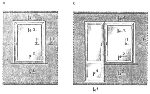 а - оконный блок с вертикальным импостом; б - оконный блок с безимпостным (штульповым) притвором; А - расстояние между крепежными деталями Рисунок В.1 - Примеры расположения опорных (несущих) колодок и крепежных деталей В.5 Устройство монтажного шва В.5.1 Устройство монтажного шва выполняют в соответствии с проектно-конструкторским решением, согласно технологической документации и требованиям настоящего стандарта. Заполнение монтажного зазора производят послойно с учетом температурных и влажностных условий окружающей среды, а также рекомендаций производителя изоляционных материалов. Порядок устройства монтажных оконных швов в условиях температур, ниже рекомендованных производителями изоляционных материалов (например, с использованием обогрева материалов и поверхностей строительных конструкций), должен быть предусмотрен в технологической документации. Кроме этого следует предусматривать особенности устройства швов при повышенном влагосодержании стеновых материалов в области оконного проема. (Измененная редакция. Поправка.) В.5.2 При использовании в наружном слое саморасширяющихся изоляционных лент учитывают следующие требования: - для обеспечивания плотного примыкания в горизонтальном и вертикальном направлениях шва ленты раскраивают по длине с припуском 1,0 - 1,5 см на каждую сторону; - ленты крепятся посредством монтажного самоклеющегося слоя на расстоянии 3 - 5 мм от грани четверти по внутренней поверхности оконного проема; - если четверть, выполненная из кирпича, имеет расшивку или углубления в швах, то ленту крепят непосредственно к коробке оконного блока до установки ее в проем; - перелом лент под углом не допускается; - возможен изгиб ленты при изоляции шва оконного блока арочной или круглой конфигурации; - нанесение штукатурного слоя, шпатлевки или красящих составов на паропроницаемый материал наружного слоя не допускается. В.5.3 Для устройства центрального тепло-, звукоизоляционного слоя рекомендуется применение пенного утеплителя. Заполнение монтажного зазора пенным утеплителем следует выполнять при полностью собранном и окончательно закрепленном оконном блоке, при этом следует контролировать полноту и степень заполнения монтажного зазора. Перед началом работ следует провести пробный тест на первичное расширение пенного материала в условиях окружающей среды монтажной зоны и при работе не допускать выхода излишков пены за внутреннюю плоскость профиля коробки оконного блока. Срезка излишков пенного утеплителя допускается только с внутренней стороны монтажного шва при условии устройства сплошного пароизоляционного слоя. В случае применения профилей коробок шириной более 80 мм и если ширина монтажного зазора превышает размеры, предусмотренные настоящим стандартом заполнение зазора следует выполнять послойно, с интервалами между слоями по технологии, рекомендованной производителем пенного утеплителя. (Измененная редакция. Поправка.) В.5.4 Внутренний пароизоляционный слой устанавливают непрерывно по всему контуру стенового проема. При использовании для изоляции внутреннего слоя пароизоляционных ленточных материалов следует руководствоваться следующими требованиями: - раскрой лент по длине следует выполнять с припуском для нахлеста в местах угловых соединений; - соединение лент с поверхн